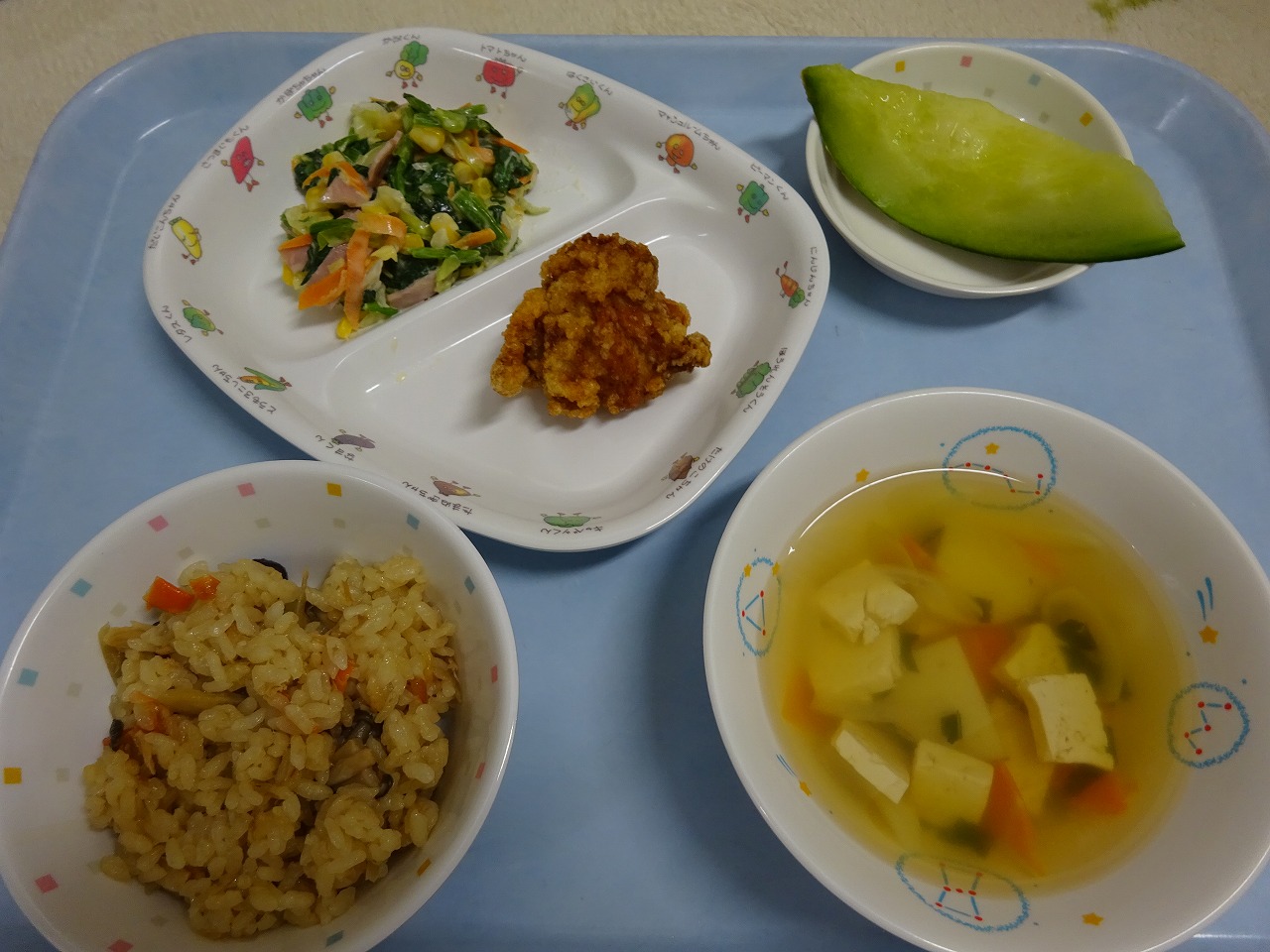 6月30日(火)給食 ・味ごはん(米・ツナ・にんじん・ごぼう) ・鶏肉のから揚げ ・ほうれん草とハムのサラダ(キャベツ・ほうれん草・にんじん・ハム・コーン・マヨドレ) ・すまし汁(豆腐・かまぼこ・にんじん・玉ねぎ・みつば) ・メロン