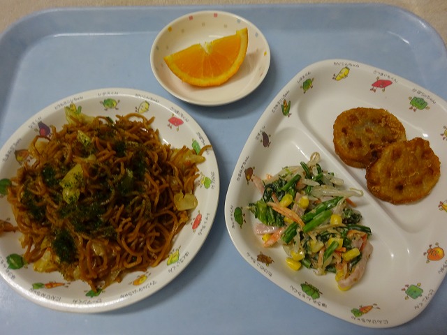 3月19日(木)給食 ・焼きそば(麺・豚肉・キャベツ・玉ねぎ・にんじん・ピーマン) ・ほうれん草とハムのサラダ(ほうれん草・ハム・もやし・にんじん・コーン) ・れんこん挟み揚げ ・オレンジ