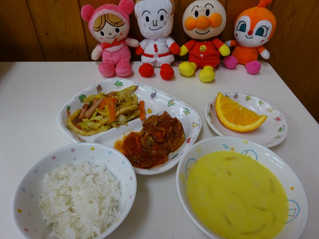 3月24日(火)給食 ・ごはん ・煮込みハンバーグ(ハンバーグ・玉ねぎ・にんじん・マッシュルーム) ・いろどりソテー(ウインナー・キャベツ・ピーマン・にんじん・フライドポテト) ・かぼちゃスープ(かぼちゃ・玉ねぎ・豆乳) ・オレンジ