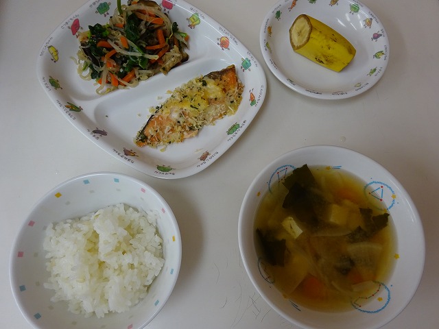 3月25日(水) 給食 ・ごはん ・鮭のサクサク焼き(鮭・パン粉・粉チーズ・パセリ・マヨドレ) ・ごもくあえ(ほうれん草・にんじん・もやし・油揚げ・しらたき・干ししいたけ) ・みそ汁(豆腐・だいこん・にんじん・玉ねぎ・わかめ・みそ) ・バナナ
