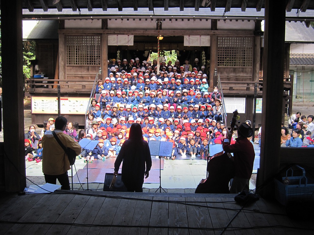 Goo連帯の皆さんと、南保育園職員のピアノ演奏に合わせ、未就園児親子、保育園児、地域の方が元気いっぱいに歌ってくれました。 子どもから大人まで知っている曲ばかりだったので、演奏が始まると手を叩いたり、踊ったりしながらゆったりとした時間が過ごせました。 木漏れ日が差し込む中、神社という厳かな場所にGoo連帯の素敵な演奏と、子どもたちの元気な歌声が響いていました。