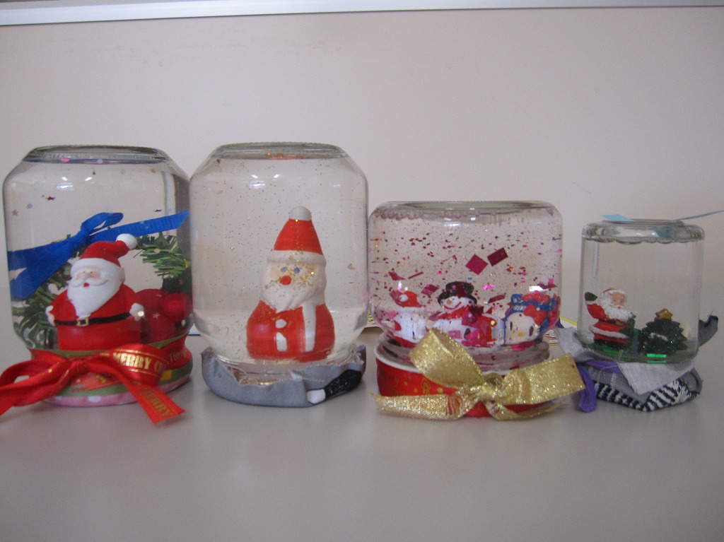 親さんはクリスマスにピッタリの置き物や、子どもの好きなキャラクターを中に入れるなど、喜んでもらえるよう考えてありました。 中に入れるものやラメの量、飾り付けなどは様々で、親さんのアイデアと個性あふれる素敵なスノードームができました。 参加できなかった方、支援センターで作れますので是非作りにいらして下さい。