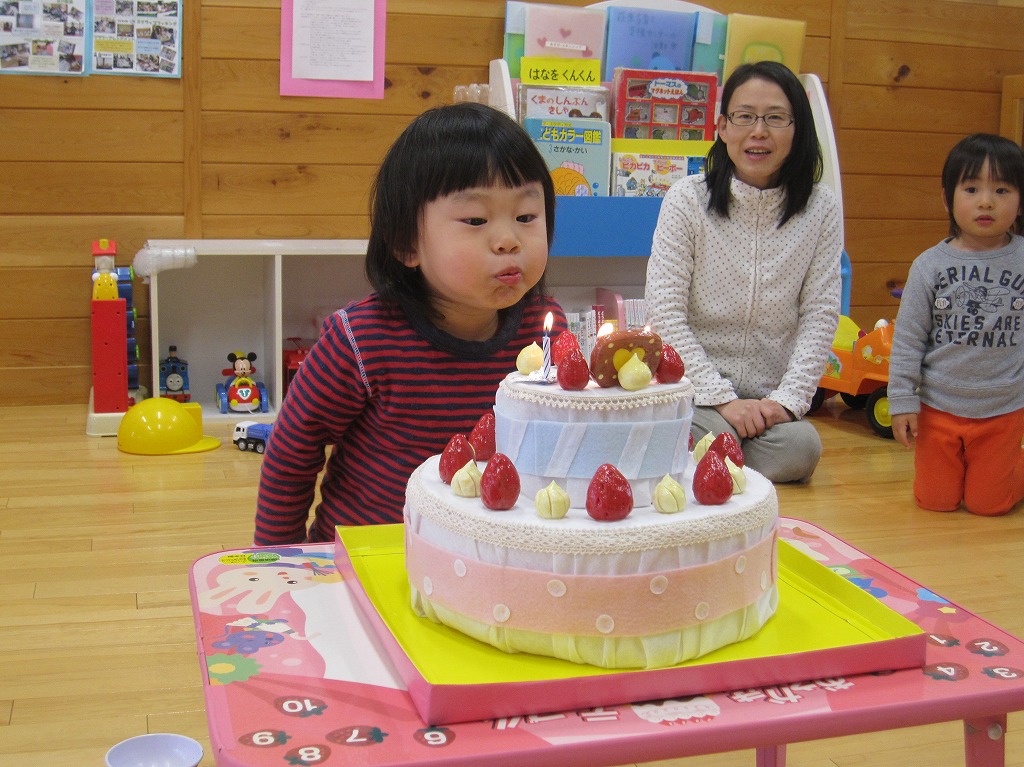 パネルシアターでは3歳児の子がなぞなぞに答えてくれ、正解するとニコッと笑顔になったり、拍手をして喜んでいました。 インタビューではマイクを持って答えたり、ろうそくを消えるまで何度も諦めなかったり、お兄さんらしい姿を沢山見せてくれました。 11月生まれのお友だち、お誕生日おめでとう。