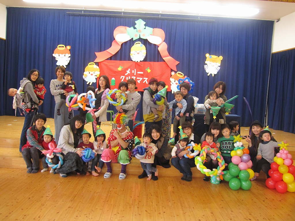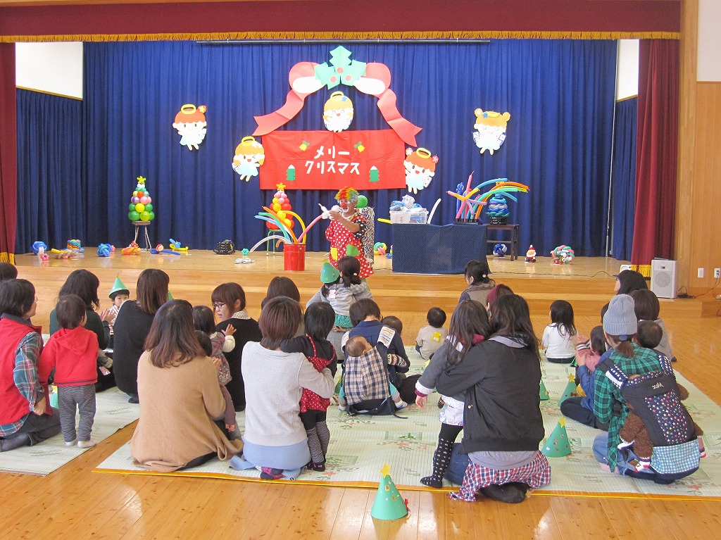 三角帽子を作り、かぶってトッチーさんを迎えました。 トッチーさんによるバルーンショーでは、手を叩いたり「おぉ〜」と歓声が上がったり、親子共に楽しんでいる様子でした。 トッチーさんからのプレゼント、バルーンアートの中には、クリスマスツリーやリースなどもあり、子どもたちも大喜びでした。