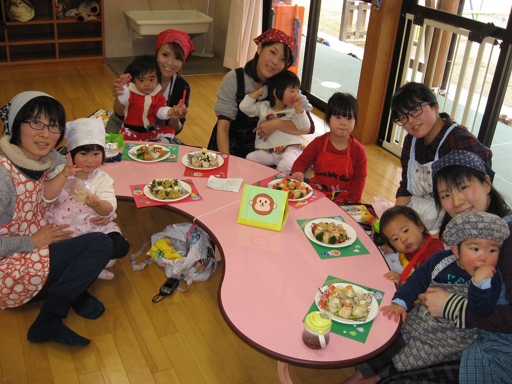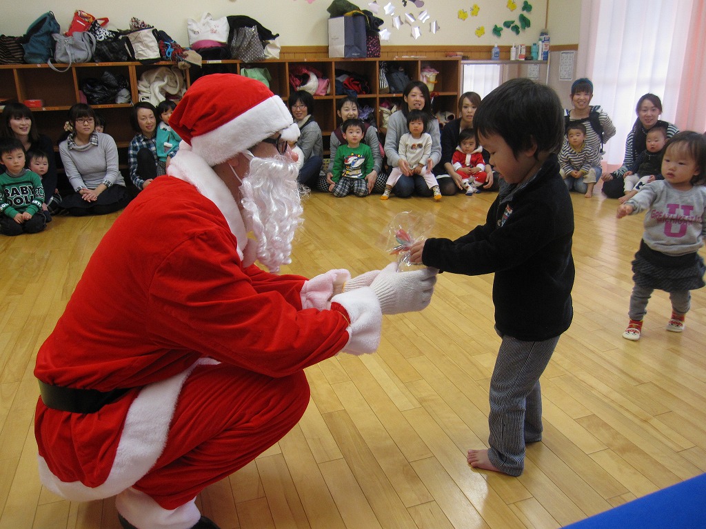 サンタさんの登場には思わず泣いてしまう子もいましたが、一人一人サンタさんからお母さんの手作りプレゼントをもらうことができました。