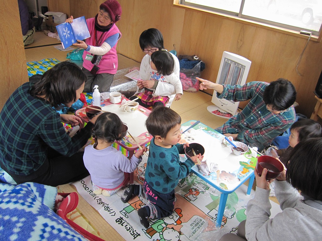 小池明聖先生と共に雪のビンゴや宝探し、雪うさぎ作り、ソリ遊びを行いました。 今日は雪が降ってくれたおかげで、親子で雪遊びを楽しむことができました。 寒いと言う子はおらず、みんなが夢中になって遊んでいました。 最後は温かい部屋の中でぜんざいを頂きながら、子育てについて明聖先生にお話をしていただきました。