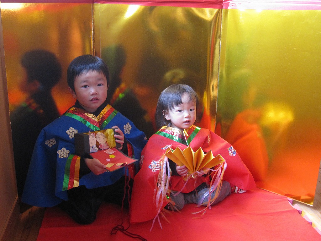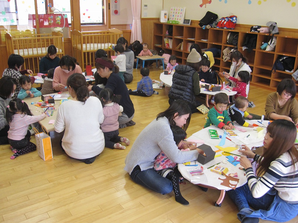 2歳児でも、のりやハサミを積極的に使う子がいて、周りの親さんが危険のないように見守って下さり、安全に製作に取り組むことができました。 お雛様の衣装にも興味を持ち、着てくれる子が多く、可愛らしいお雛様とお内裏様を見ることができました。