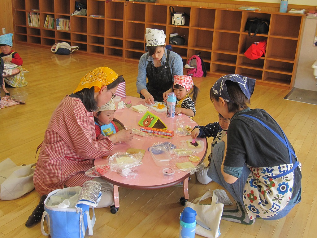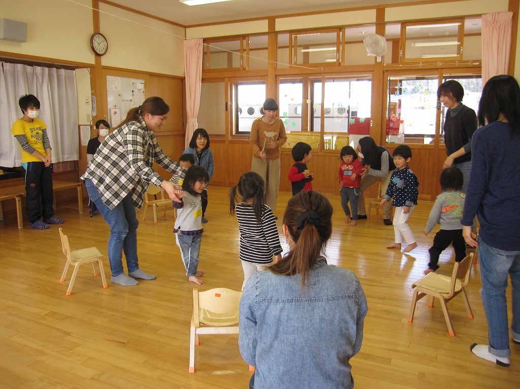 年中さんの歌を聴かせてもらったり、ゲーム、クルクル紙芝居、プレゼント渡し、クッキングを行いました。 4月から年少さんになるお友だち、親さん同士かかわりながら楽しむことができました。