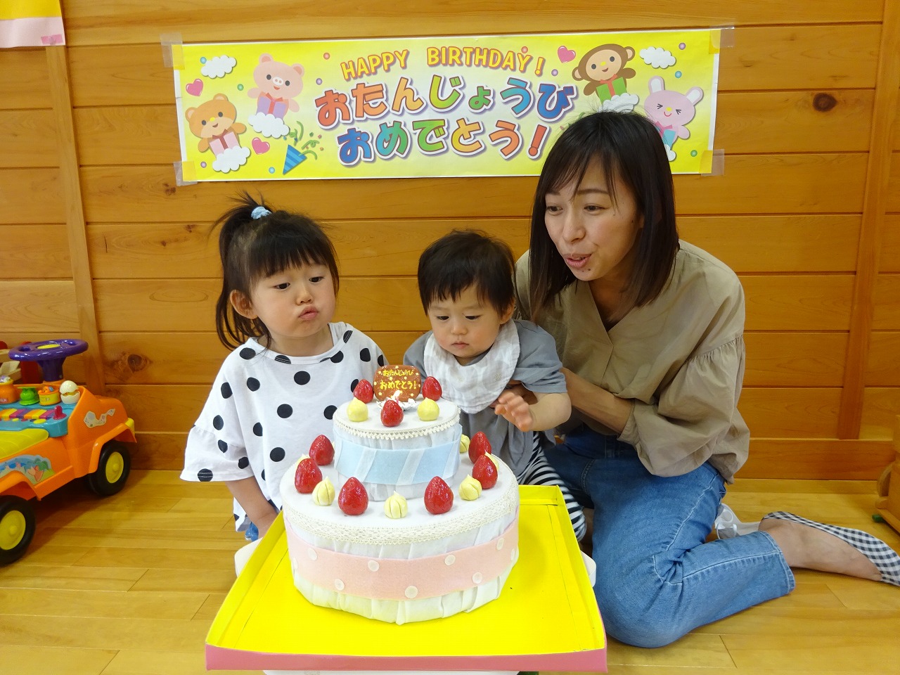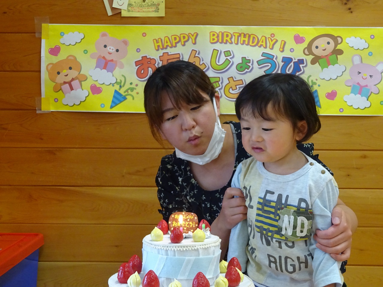 今年度も個別で誕生会を行っています。 かわいいバースデイカードに手形を押し、ろうそくのついたケーキと一緒に親子で記念撮影。身長と体重も測り、改めて「おおきくなったな〜」と成長の喜びを感じられるひとときとなりました。