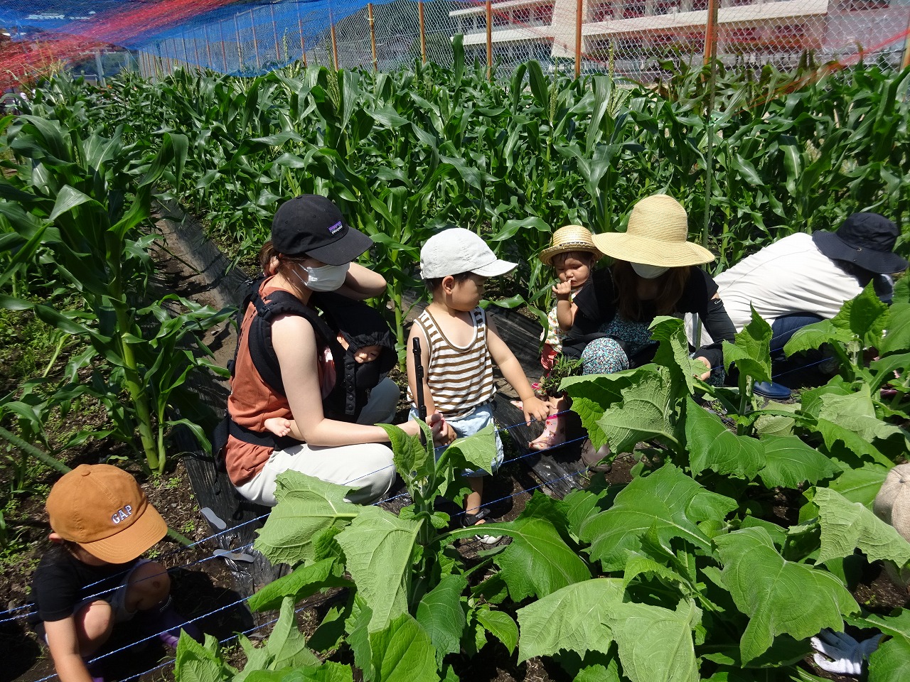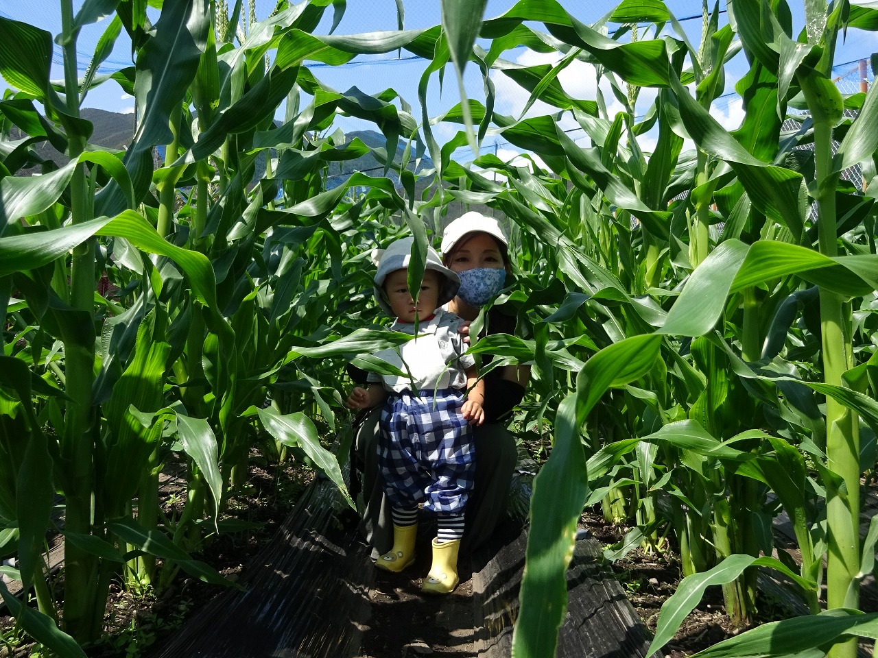 暑い中でしたが、9組の親子が参加してくださいました。前回は子どもの背丈ほどだったとうもろこしが大人の背丈ほどに生長しており、トンネルのようにくぐって楽しむことができました。 ヤーコンの葉も顔より大きくなっている中、葉をかき分け、一生懸命親子で草取りをしてくださいました。 来月の頭にはとうもろこしが収穫できる予定です。