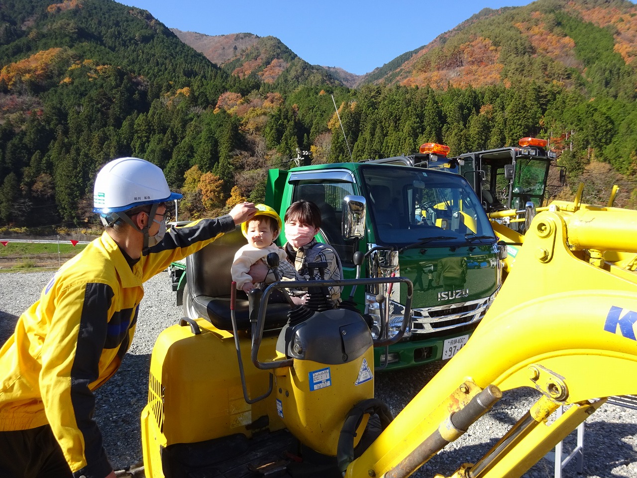 こりすくらぶの企画「馬瀬建設で重機を見よう」がおこなわれました。 馬瀬建設の皆さんがたくさんの重機とシールラリーを準備して下さり、見るだけでなく実際にダンプトラックやショベルカーに乗ったり、ゴミ収集車にゴミを入れてボタンを押したりと、親さんも初体験の方が多く親子で大興奮のひとときとなりました。 たっぷり遊んだあとはおみやげもいただけて、紅葉がきれいな大自然の中でよい時間が過ごせました。