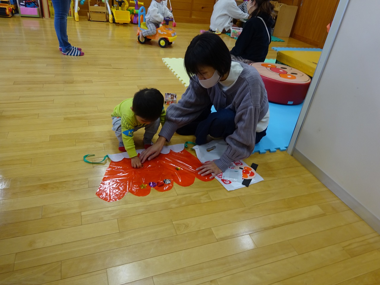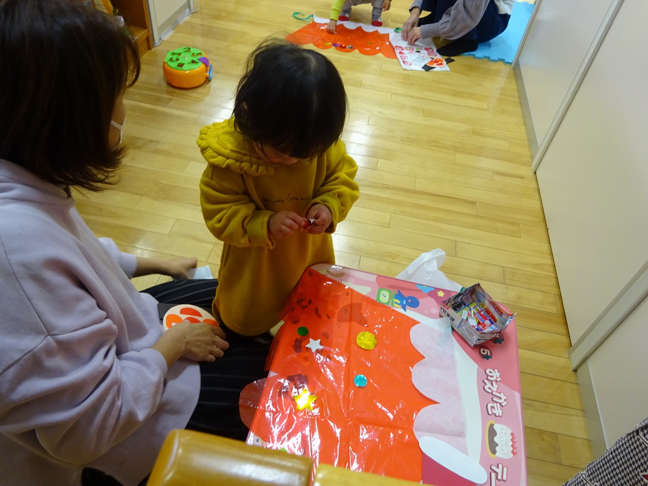 クリスマスに向けて、アンパンマンサンタに変身できる製作キットを配布しました。 アンパンマンのお面とマントにクリスマスらしいシールを貼れる製作にしたので、支援センターでも作れるようにしたところ、親子でゆったりと会話をしながら楽しく製作する姿が見られました。 自分で作った作品はとても嬉しいようで、早速身に着けて遊ぶお子さんの姿がとてもかわいらしかったです。