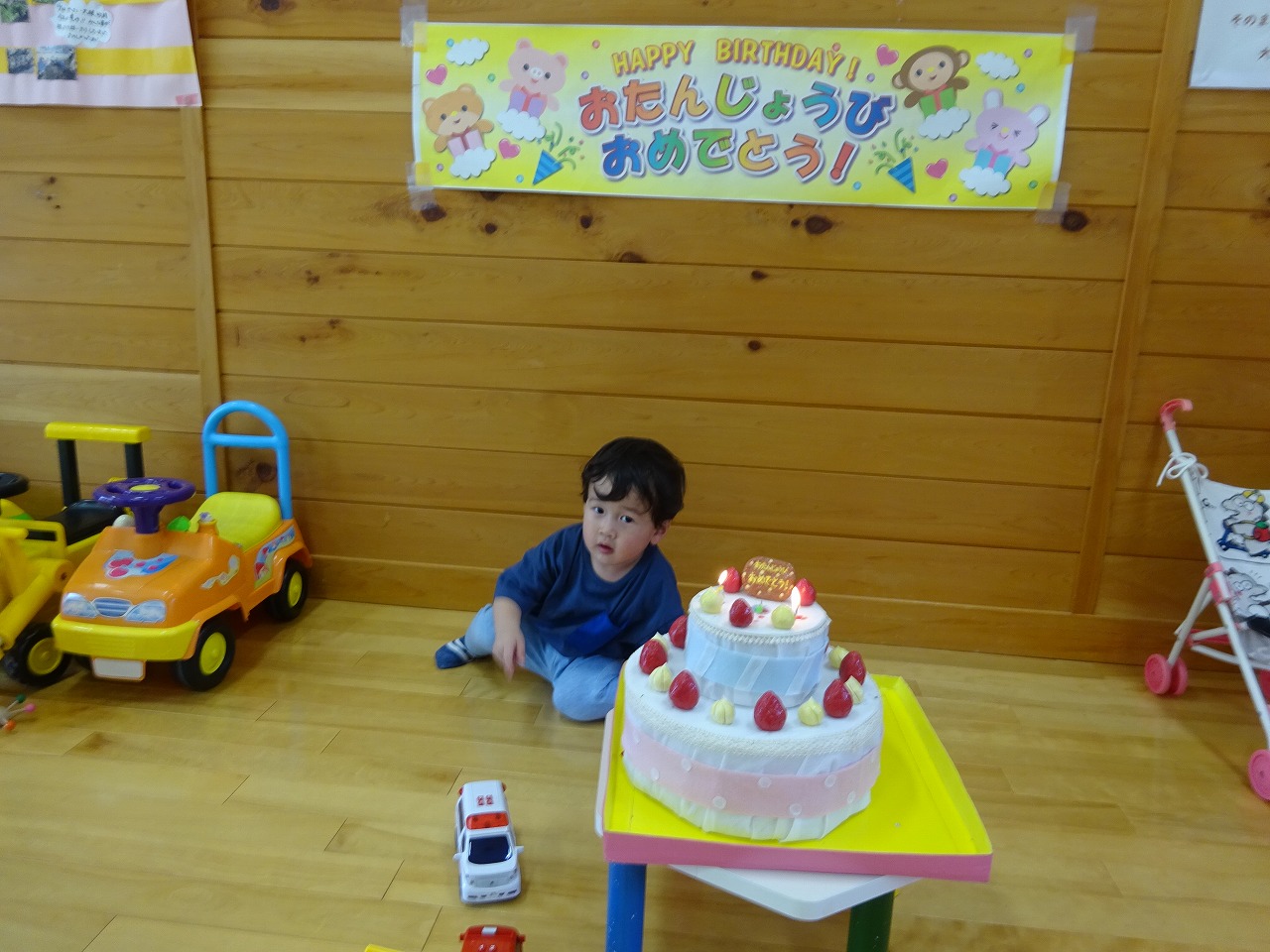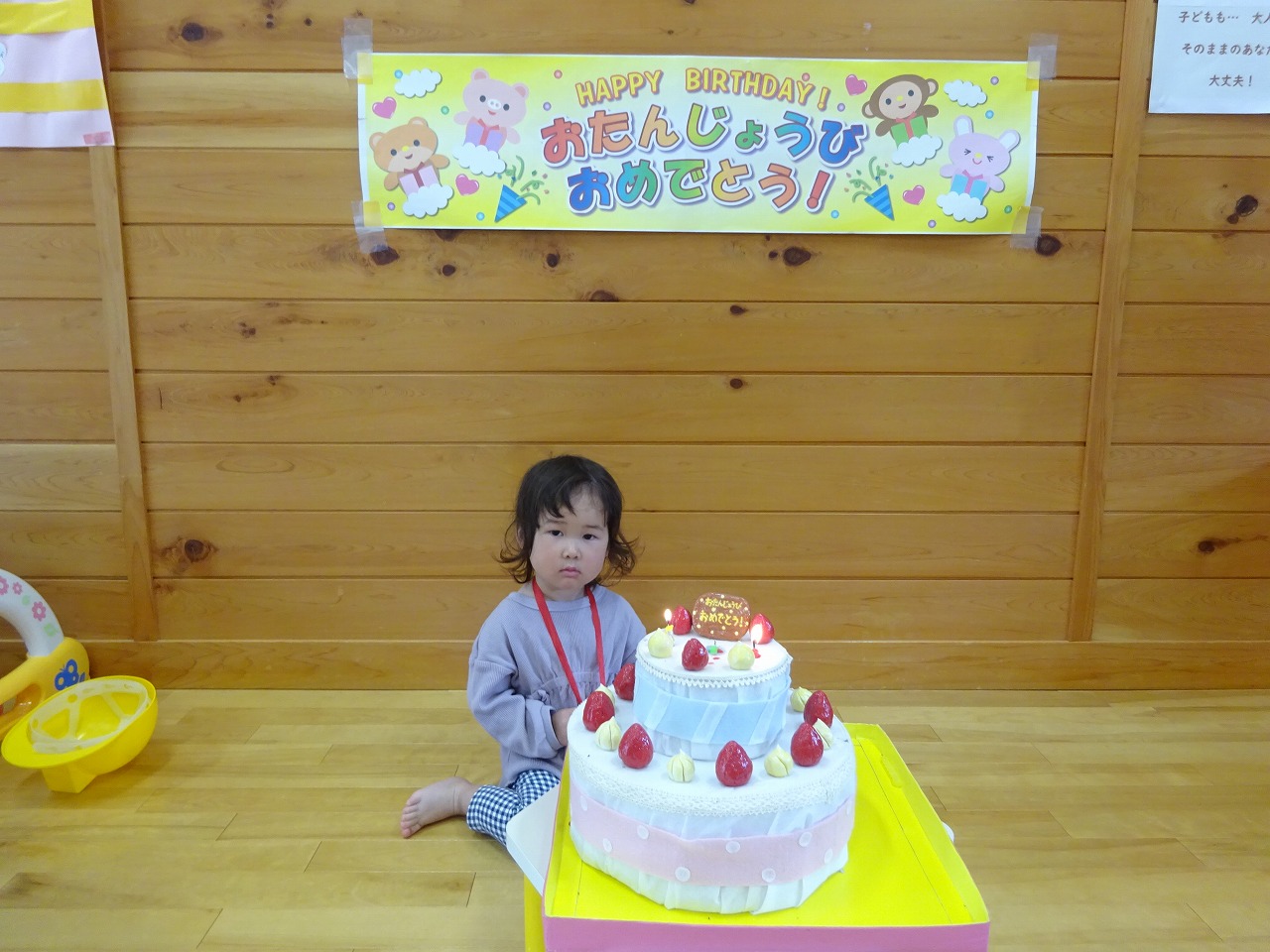 今年度も個別に誕生会をおこないます。今月は4組の親子が誕生会をしました。大きなケーキとろうそくの前でニッコリ。みんなに拍手をしてもらってとても嬉しそうな表情が印象的でした。