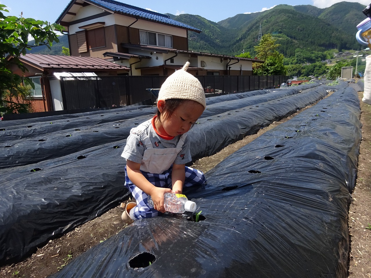 5月24日(火)農園デーをおこない、7組14名が参加しました。 先週植えたヤーコンの土がカラカラだったので水やりをしていただくと、少し経ってシャキッとしてきたので参加して下さる皆さんの力を感じました。 とうもろこしは小さな芽が顔をのぞかせていたので、お母さん方は「もう芽が出てる!」と一週間の生長を喜んでみえました。 お子さんたちの反応も年齢によって様々ですが、お家の方との活動はとっても楽しそうでした。