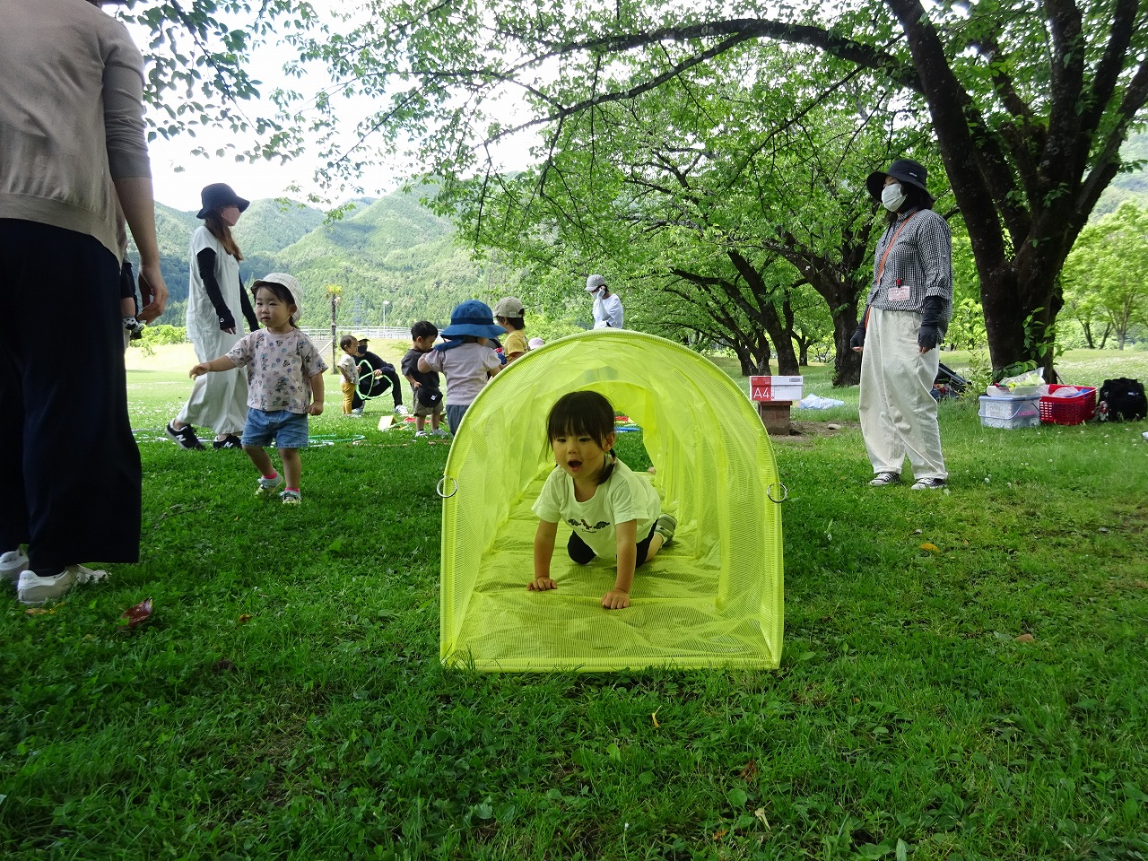 6月9日(木)、飛騨川公園でこりすくらぶがおこなわれ、来年度年少さんになるAグループの親子が参加されました。 みんなでバスごっこや体操をしたあと、トンネルやフープ、ボールや輪投げを使い、体をたくさん動かして遊びました。 木陰がたくさんの広い野原でお母さんや友だちと一緒に遊ぶことができてとても楽しそうでした。