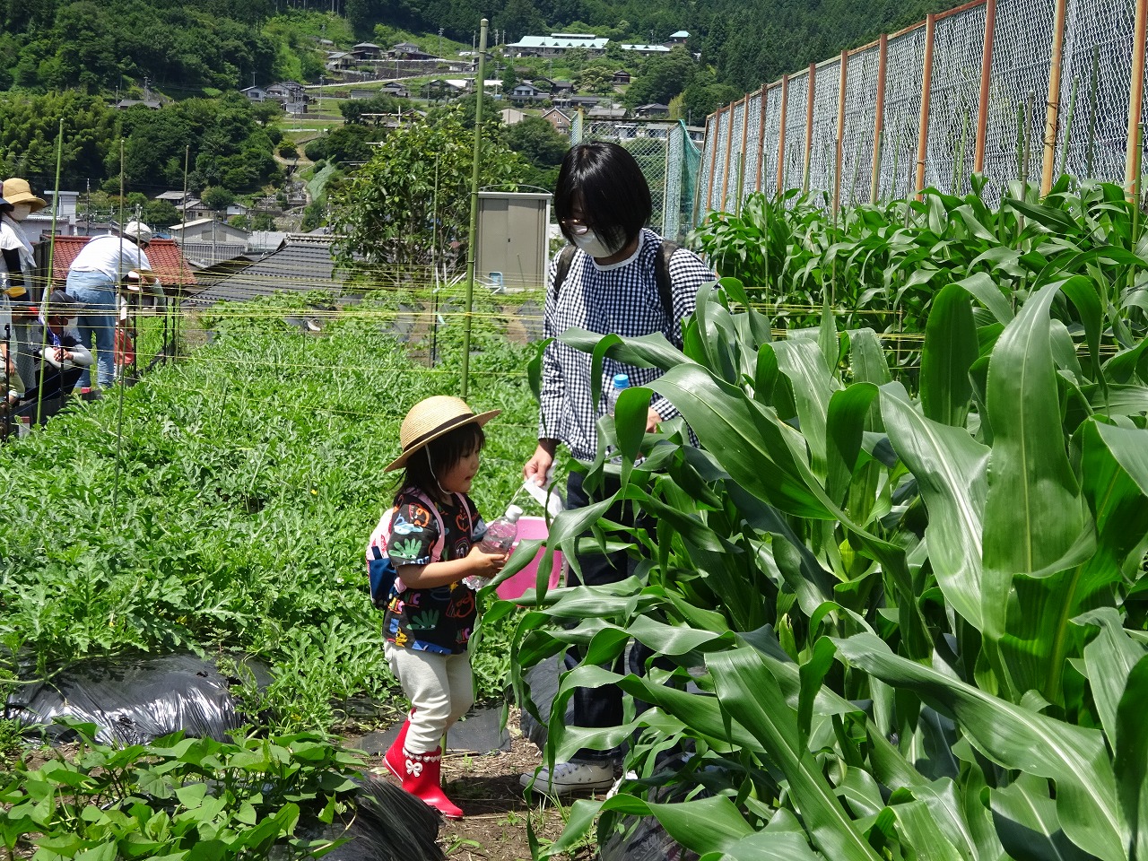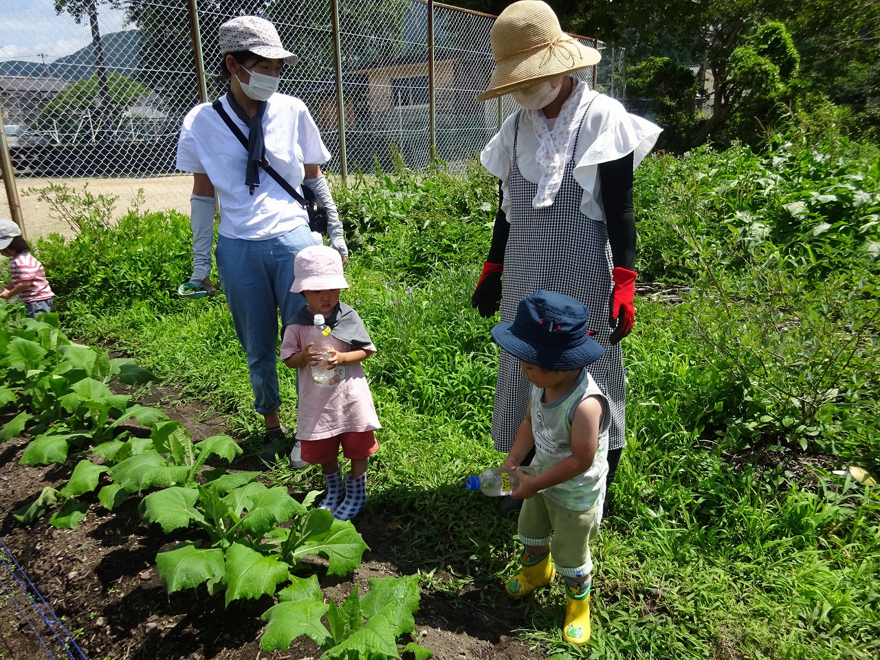 6月28日(火)、農園デーをおこない、9組の親子が参加されました。 1週間前に子どもの背丈ほどだったとうもろこしが、この日は大人の背丈くらいになっていたので皆さんびっくりしてみえました。とうもろこしトンネルをくぐるのがとても楽しかったようです。 暑かったので、ヤーコンのカラカラの土にもたっぷり水やりをしてくれたお子さんたちでした。