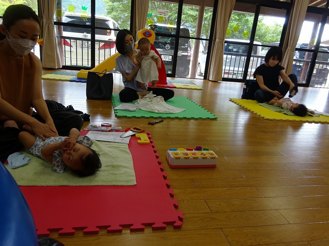 6月27日(月)、北児童館でベビーマッサージ講座をおこない、4組の親子が参加されました。 初対面の皆さんでしたが、自己紹介や講師の小林英子さんとの会話でお母さん同士の話が弾み、和やかな雰囲気の中でベビーマッサージをすることができました。 赤ちゃん、お母さん共にリラックスできたひとときとなったようでした。