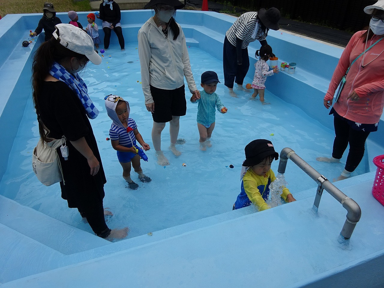 音楽と絵本で準備体操をしたあとは、みんなでプールへ。最初は小さなプールで遊んでいた子も友だちの姿を見て、大きいプールに挑戦し、水しぶきを浴びながらキャッキャと楽しんでいました。