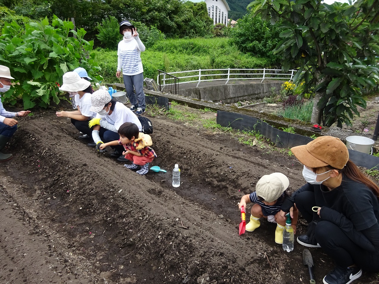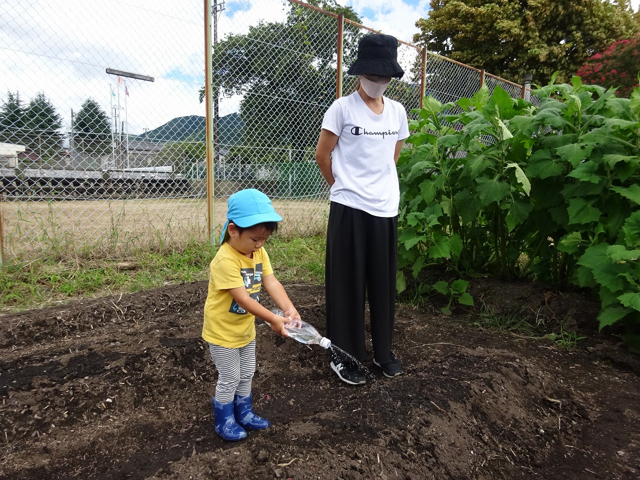 9月6日(火)、おひさま農園で大根の種まきをおこない、空いている畑に人参の種も蒔きました。 14組の親子が参加して下さり、とうもろこしの種との違いや色の違いに気づきながら、親子でゆったりと種まきをすることができました。農園をたくさん経験しているお子さんは、土をそーっと被せることや優しく水やりをすることに慣れてきており、お子さんたちの成長も感じることができました。