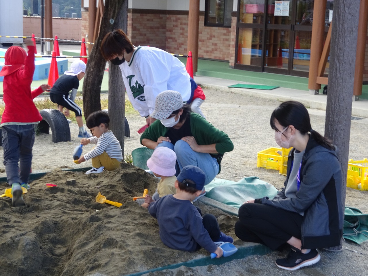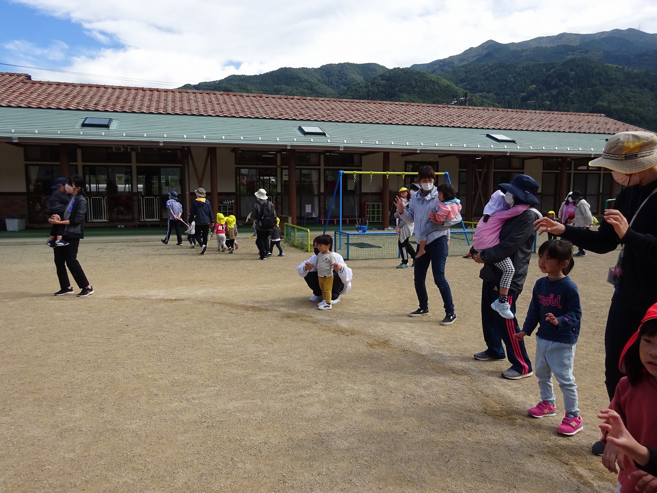 朝は風が冷たく寒かったですが、外で遊ぶ頃にはいいお天気になり、年中さんとの外遊びを楽しむことができました。遊具に登ったり、砂場で本物のキッチン道具でおままごとをしたり、年中さんの真似をしてリレーをしたりと思い思いの遊びを楽しむことができました。最後は年中さんと一緒に「からだダンダン」の体操をしてみんなで仲良くお片付けができました。来年度年少さんに入るお子さんも多かったので、入園のイメージが少しできたのではないかと思います。