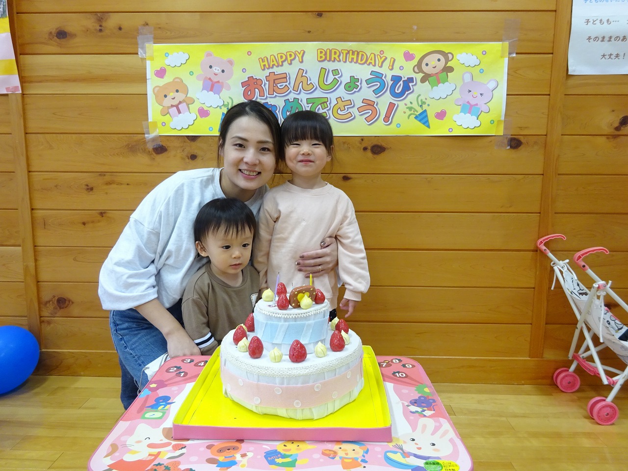 今月も個別で5組の誕生会をおこないました。3組は偶然同じ日に誕生会をされたので、一緒にお祝いができ、年齢もばらばらだったので年齢に応じたそれぞれの反応がとてもかわいかったです。他の利用者さんもたくさんお祝いしてくださり、お母さん方も嬉しそうでした。