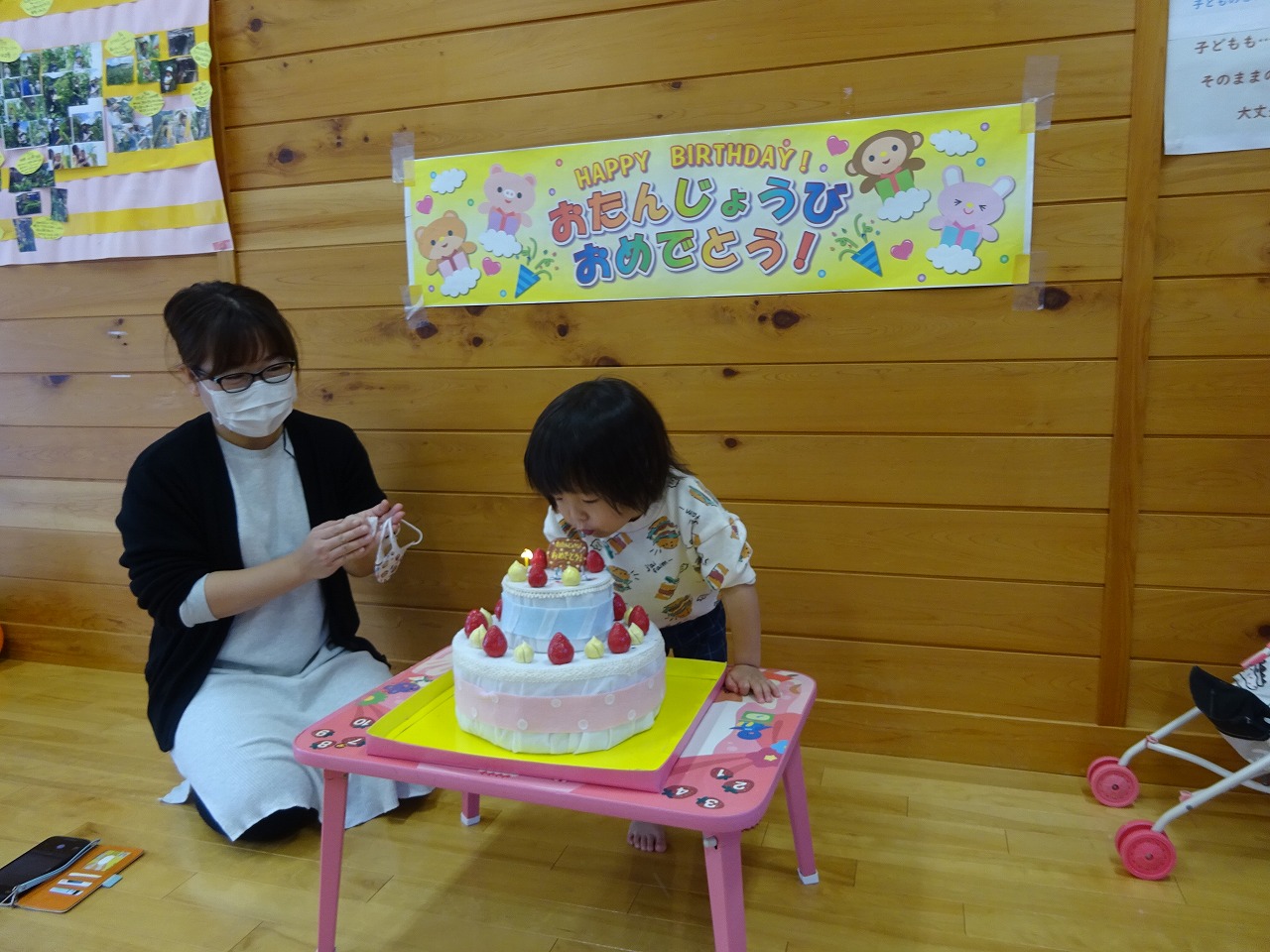 今月も個別で誕生会をしました。3歳になったお子さんには「大きくなったら…?」とインタビューしてみるととても嬉しそうに答えてくれました。お祝いをして下さった利用者さんがたくさんいたので、みんなでそれぞれのお子さんの成長を感じることができました。