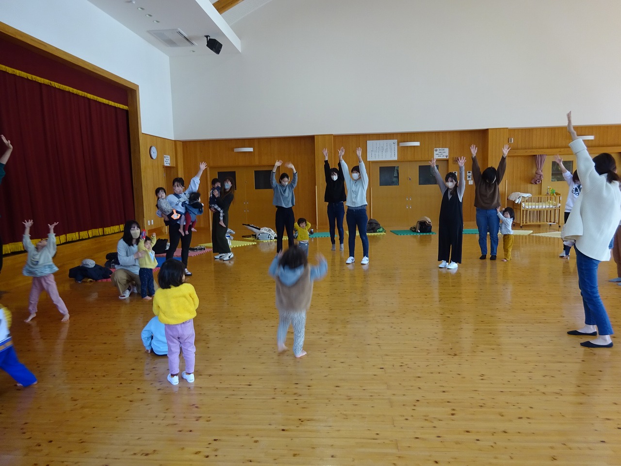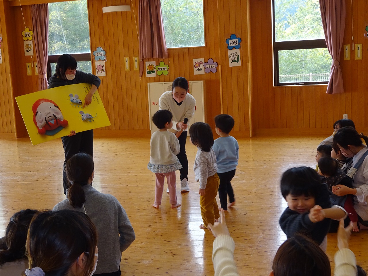 1月10日(火)みなみこども園遊戯室で松井淑恵先生によるリトミックをおこない、14組の親子の参加がありました。 最初にピアノの音に合わせてゆったりとあいさつや返事をしたり、おうちのかたとふれあい遊びをしました。少し慣れてきた頃に今度は広い遊戯室でいろんな音に合わせて歩いたり、走ったり、しゃがんだりと色々な動きを楽しむことが出来ました。「あっぷっぷ」の大型絵本のあとは年中さんが一緒に体操をしてくれてプレゼントもしてくれました。お兄さん、お姉さんともよい交流ができたのでよかったです。