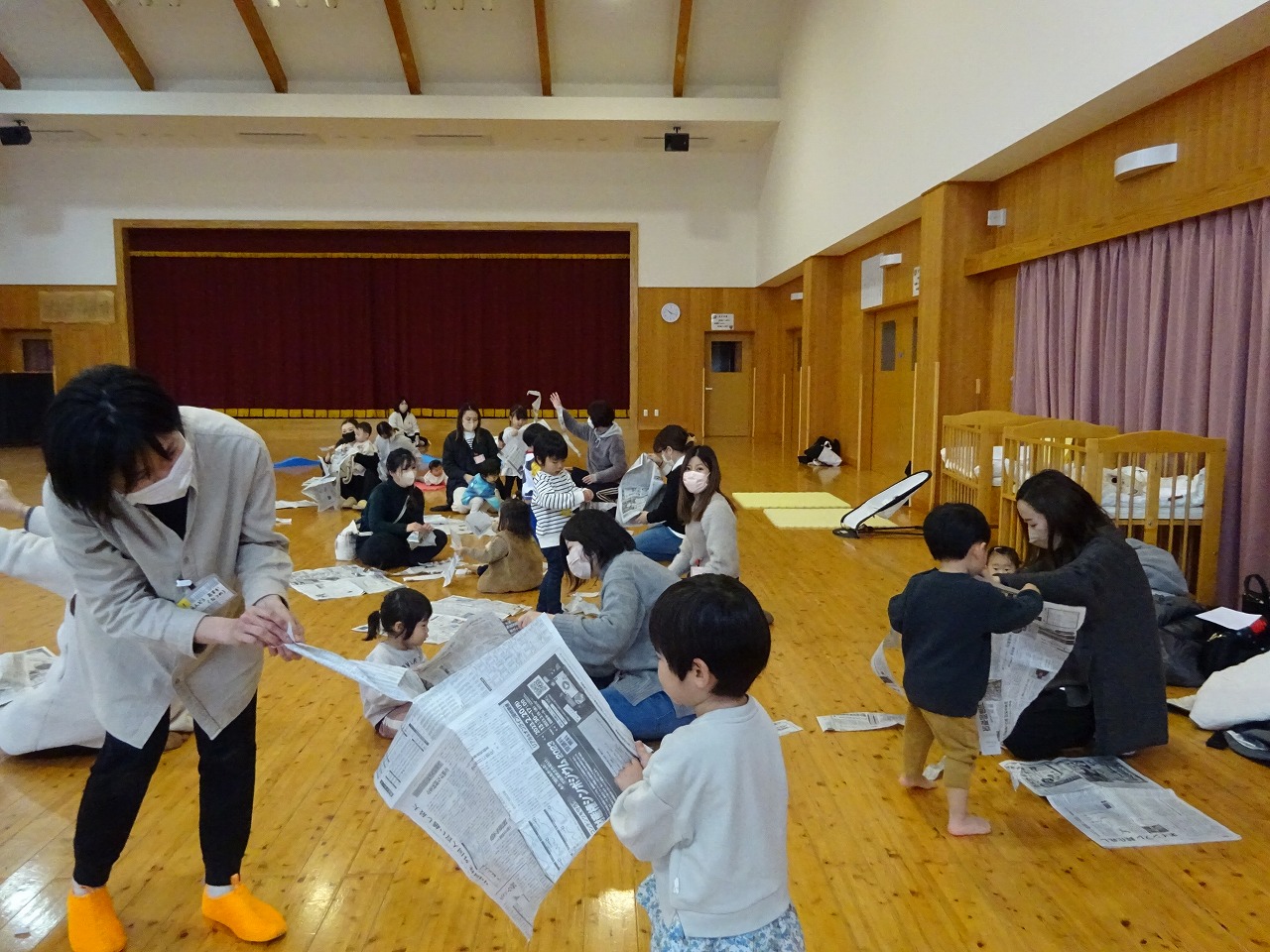 2月10日(金)、みなみこども園の遊戯室でこりすくらぶがおこなわれ、親子で新聞遊びを楽しみました。