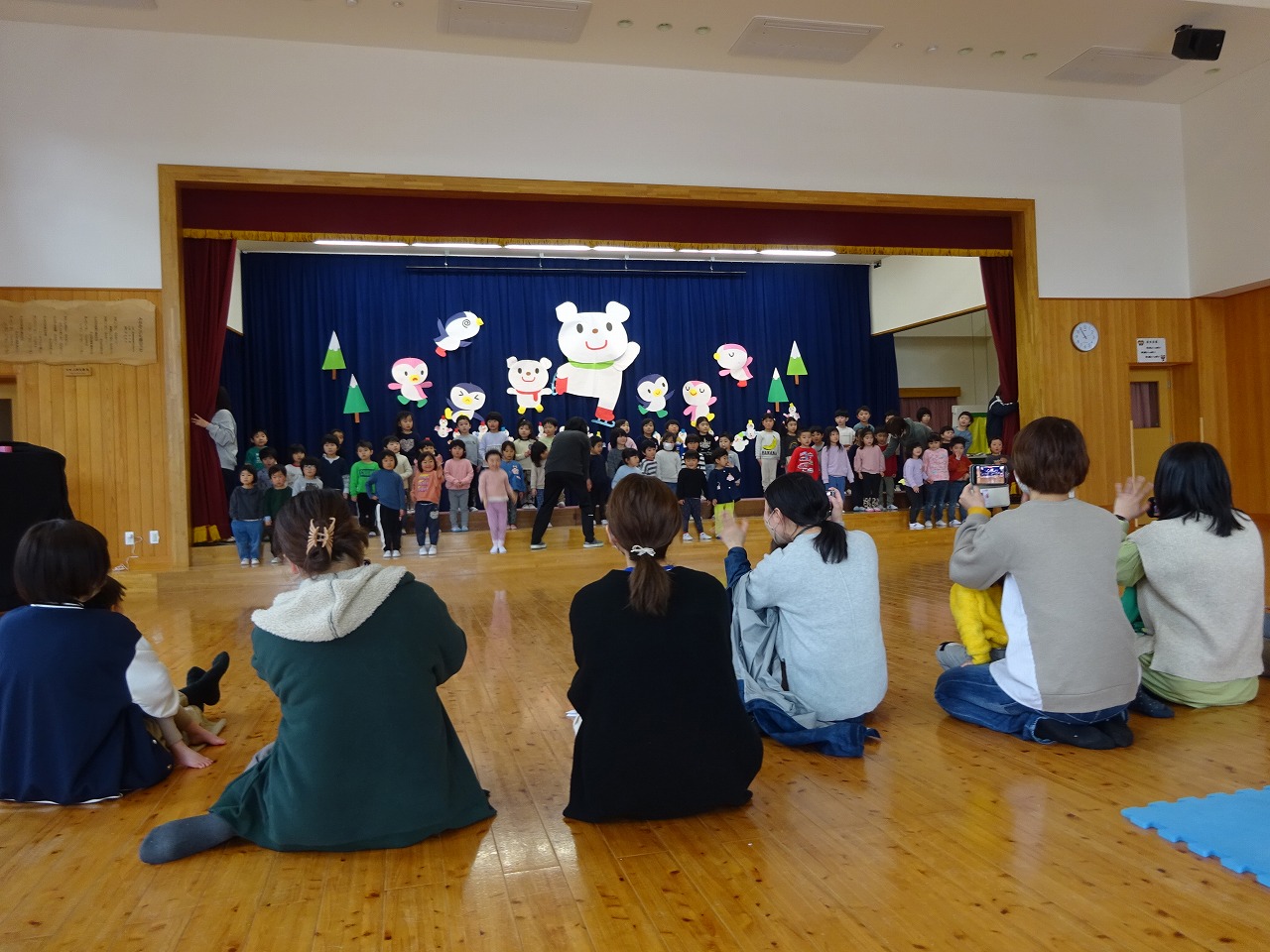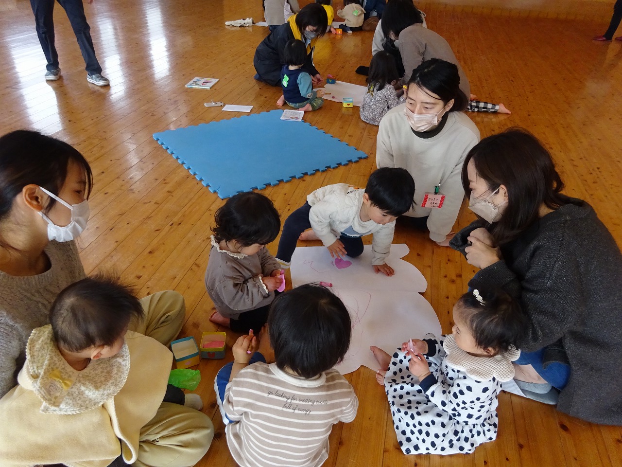 3月1日(水)遊戯室で乳幼児学級こりすくらぶの閉級式がおこなわれ、21組の親子が参加されました。 最初は6つのグループに分かれてお母さんたちはテーマトークで盛り上がりました。仲良くなった後は、グループでお絵描きをしました。完成し、全部合わさると大きな桜の木に!!支援センター卒業の親子さんもたくさんみえたので記念撮影をし、良い思い出になりました。最後はみなみこども園の年少さんがステージで歌をうたってくれたので、こども園への入園も楽しみになっていたようでした。