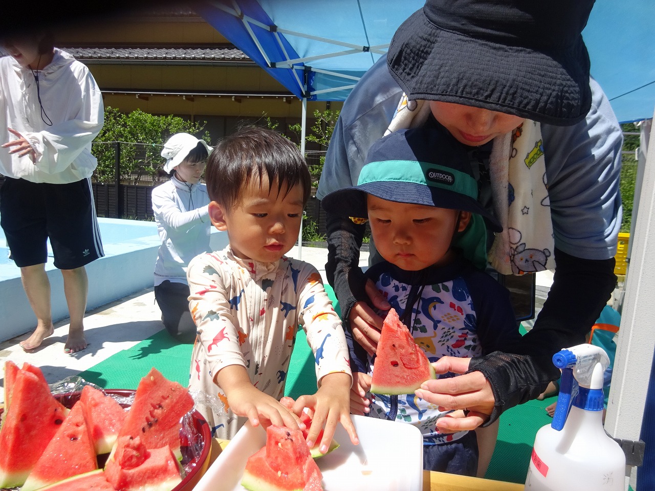 とてもいい天気となり、大きなプールにも喜んで入るお子さんたち。違う地区の方々とのおしゃべりも弾み、お母さん方もお子さんと一緒に楽しんでみえたようでした。