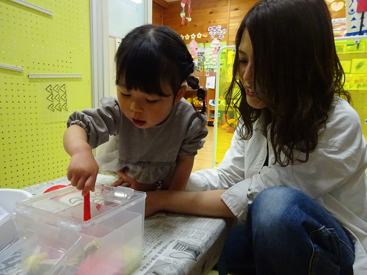 和紙でできたこいのぼりに、好きな模様を選んでもらいタンポで押して模様を付けてもらいました。自分でやるよとどんどん進めていく子、小さいお友だちはお母さんのお膝に入って手を添え一緒に製作を楽しんでみえました。クルクル回るかざぐるまや、お子さんの名前を漢字で入れて特別感があるこいのぼりにみなさん喜んで下さいました。