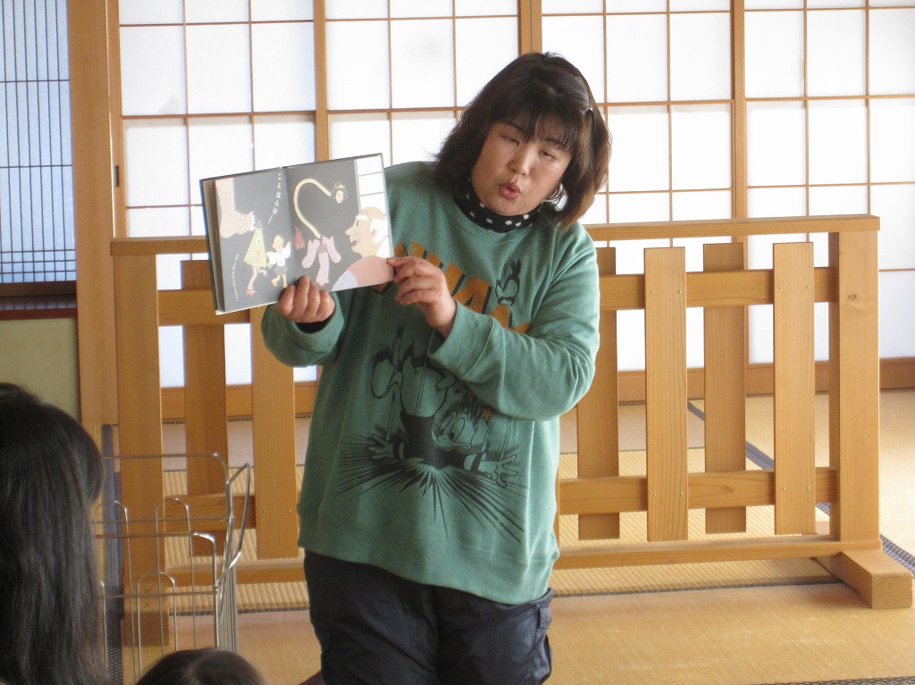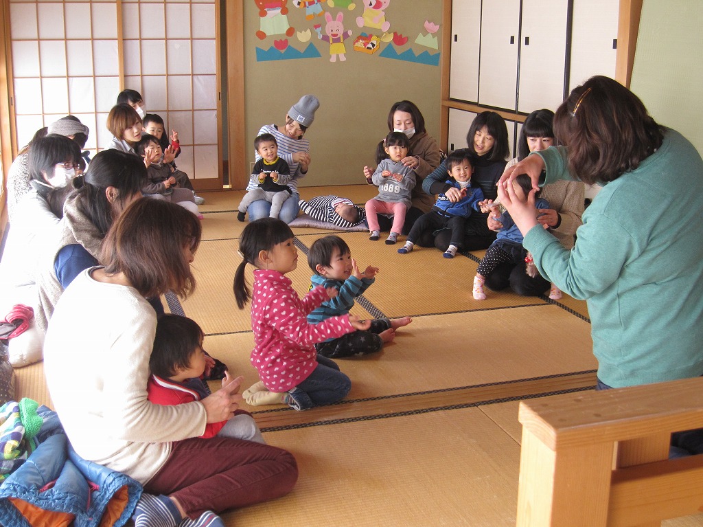 2、3人が先生の前に座り、あとの子はお母さんの膝で上手に聴けました。 内容は手遊び3種、絵本3冊、紙芝居2種でした。 途中で手遊び「納豆」のリクエストもあったりして、楽しみにして来てくれる子がいることが分かりました。