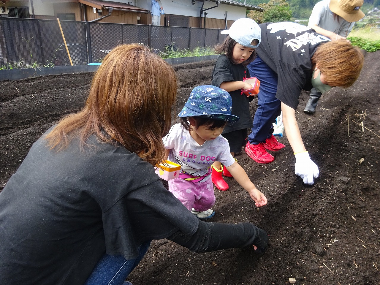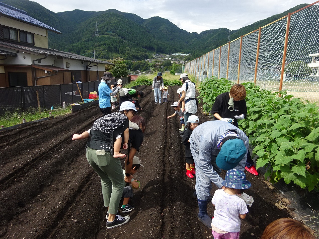 9月12日(火)おひさま農園で大根と人参の種まきをおこない、8組の親子が参加しました。 まだまだ残暑が厳しかったですが、久しぶりの農園にきれいなうねができていたのでみなさん感動してみえました。カップに入った小さな種をつまんで、お母さんの真似をしながら優しくうねに入れていたのが印象的でした。大根の種は赤くて人参の種は白いことに驚いていた方も多く、「実とは逆だね」と楽しい話題で盛り上がっていました。