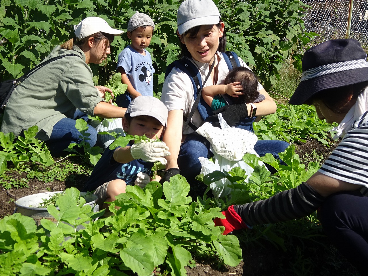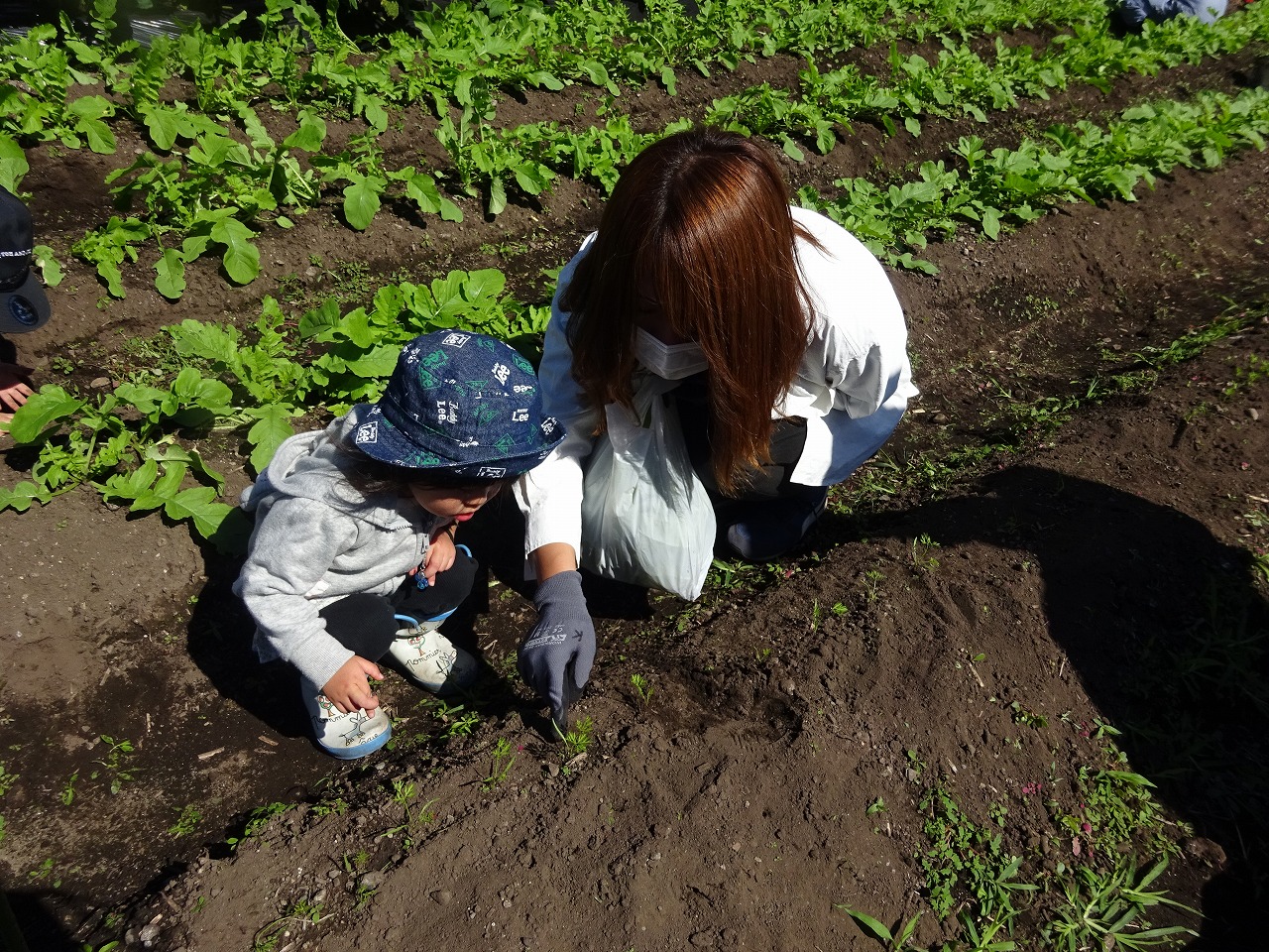 10月3日(火)、農園デーをおこない、10組の親子の参加がありました。 2週間ぶり農園デーとなったので、大根の葉は大きくなり、人参の芽も出てきていました。 間引きで大根の葉を抜くと、まだ細い大根の実がついてきたので「ごぼうみたいー」と言う子もおり、コツをつかむと楽しくてどんどん抜いていたお子さんたちでした。 栄養満点の柔らかい葉は、今が食べごろなのでおいしく味わってもらえるといいなと思います。