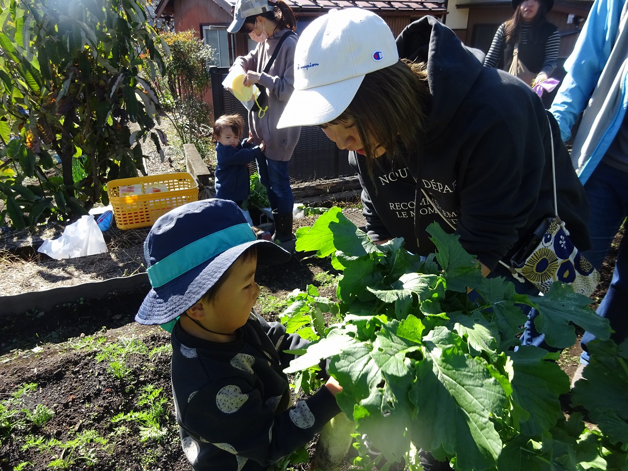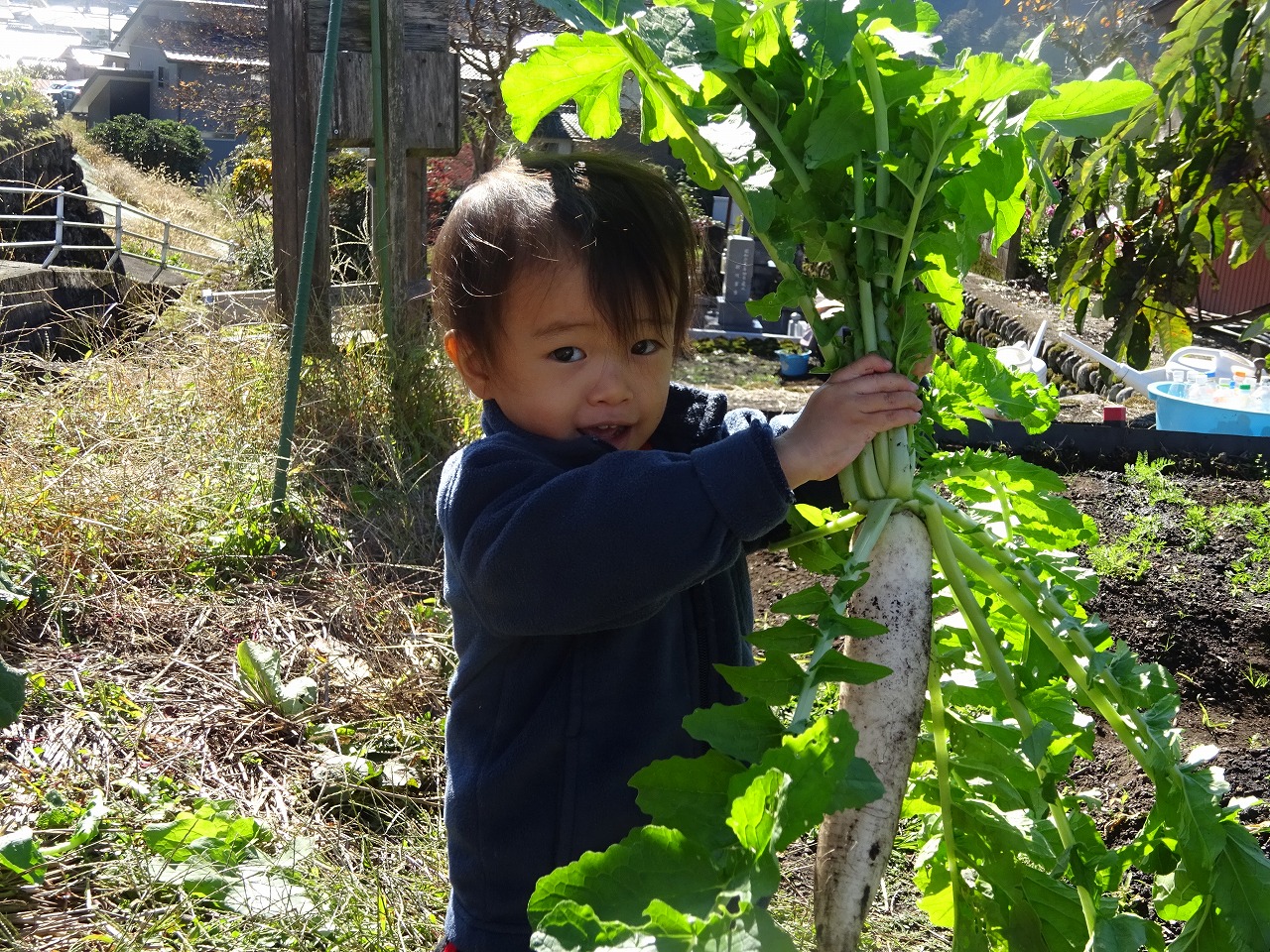 10月31日(火)おひさま農園デーをおこない、8組の親子が参加しました。水やりでは、慣れた手つきで人参の葉っぱめがけてたっぷりお水をあげてくれました。大根の試し抜きでは、大きくなった葉っぱのどこを持とうか考えながら自分で抜こうとする子が多く、力いっぱい引っ張って抜いていました。大根の勢いに尻もちをつきながらも達成感に満ち溢れた表情でとれたての大根をみせてくれたお子さんたちでした。