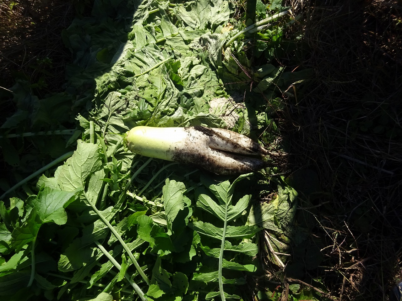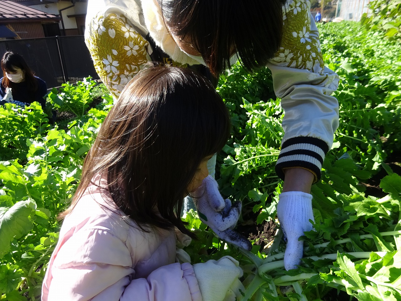11月14日(火)農園デーで大根の収穫をおこない、7組の親子が参加しました。前日より5℃も高いいいお天気となり畑の活動が心地よい気候の中で長く太く実った大根を4本ずつ抜くことができました。抜き始めはお母さんに助けを求めていたお子さんたちも、何本も抜いているうちに慣れてきたのか、4本目を抜くころには自分一人で引き抜こうと頑張る姿がありました。葉の中にテントウムシを見つけた子もおり、色々な自然現象に興味津々のお子さんたちでした。