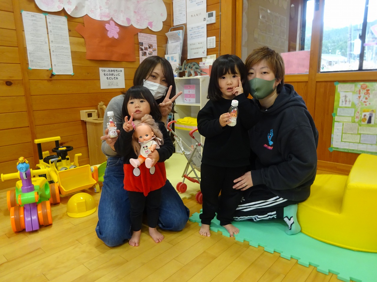 11月のつくってあそぼうは、乳酸菌飲料のボトルに古いお米と丸い発砲スチロールを入れたマラカスを作りました。親子でサンタとツリーにシールを貼ってボトルの中に入れて振ると発砲スチロールが静電気でふわふわと浮き上がり、スノードームのようになります。作った後は赤ちゃんたちも気に入って握ったり振ったり眺めたりしながら楽しんでいました。 クリスマスのおもしろクイズでママにもプレゼントがあったので喜んでいただけました。