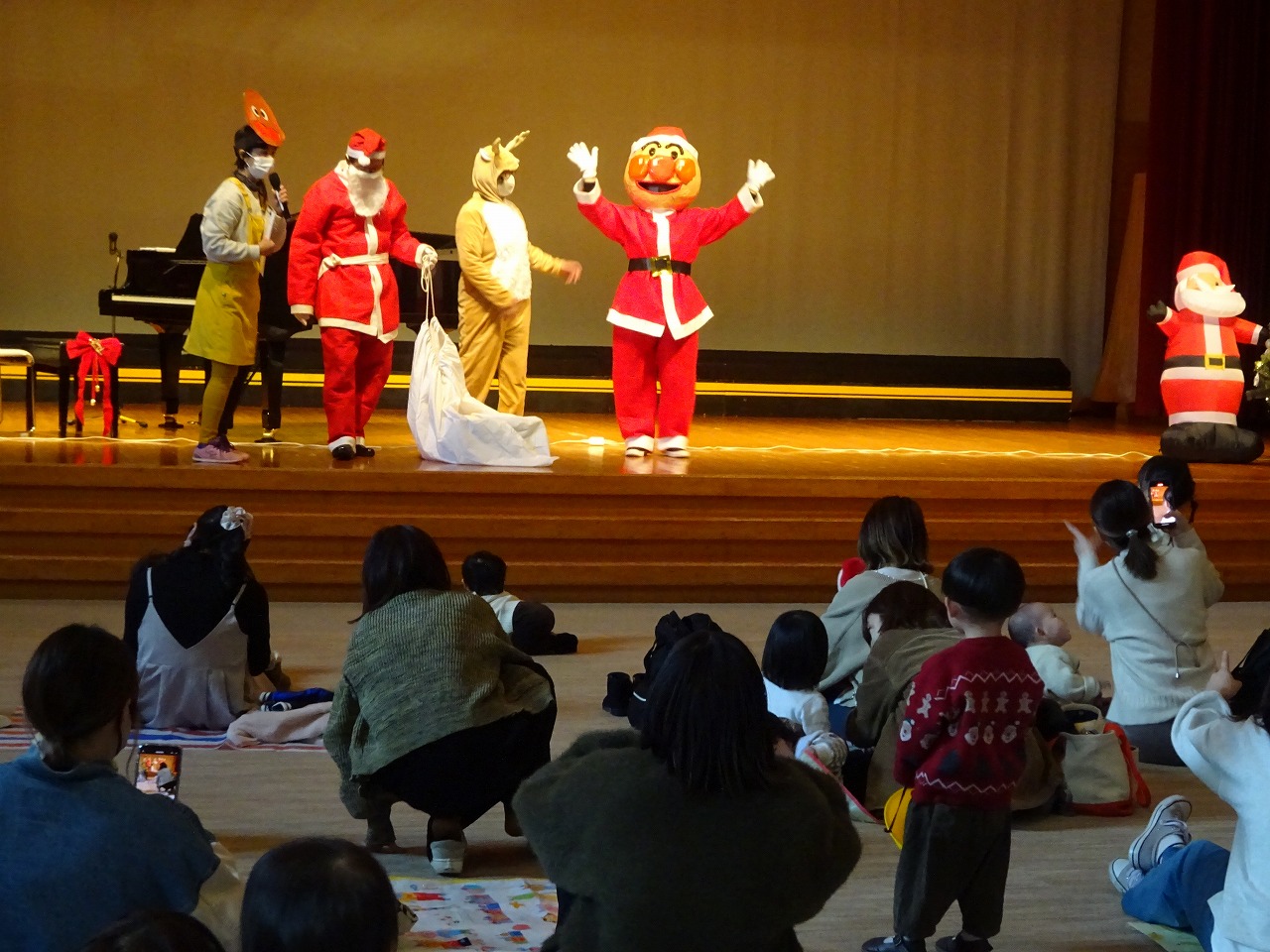 かわいいサンタさんの衣装で来場したお子さんも多く、会場のクリスマスの雰囲気にもピッタリでした。会では、最初にピアノ、クラリネットの演奏でクリスマスソングを奏でていただき、親子で体を揺らしながら本物の楽器の音に触れることができました。途中で大型絵本やパネルシアター、歌も入り、目と耳と体全体で音楽を楽しんでいたようでした。そしていよいよ鈴の音と共に、サンタさん、トナカイさん、アンパンマンサンタさんが登場!一人ずつサンタ型の音が鳴るプレゼントをもらい、大喜びしていたお子さんたちでした。最後にプレゼントを振りながら「あわてんぼうのサンタクロース」をみんなで合奏して楽しむことができました。