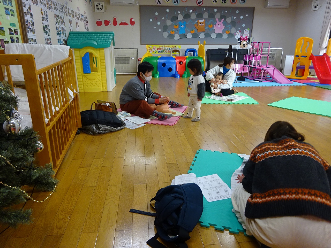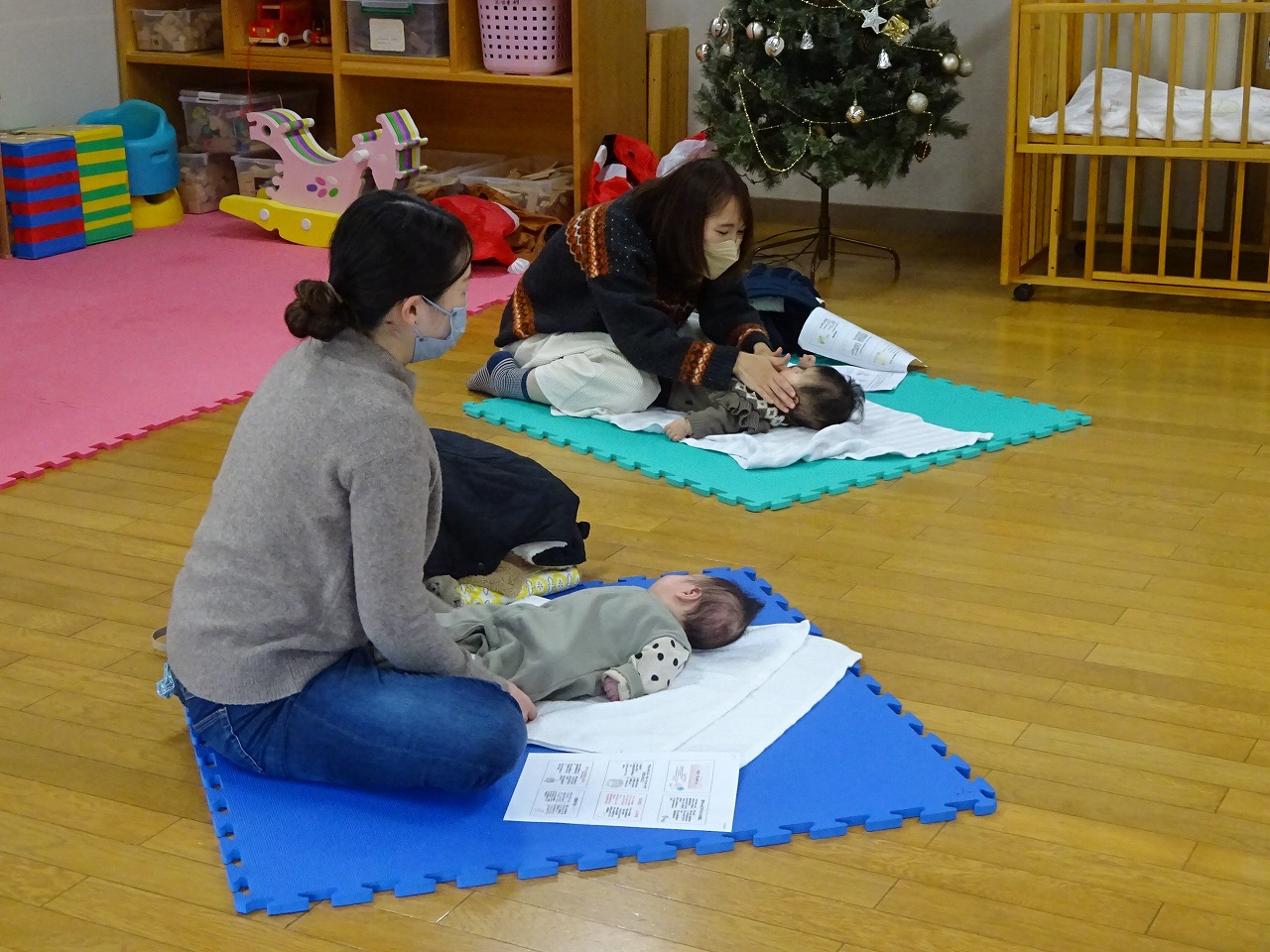 12月25日(月)北児童館でミニ講座「ベビーマッサージ」をおこない、3組の親子が参加しました。講師の小林英子さんは、年末年始の体調の整え方や周りを頼ることもいい方法といった話をして下さり、深くうなずいていたお母さん方でした。マッサージでは2子の赤ちゃんばかりだったので、貴重な1対1の時間だったようで、穏やかな笑顔がたくさん見られました。座談会では、上の子の細かいおもちゃの対処法などについて話題があがり、有意義なひとときとなりました。