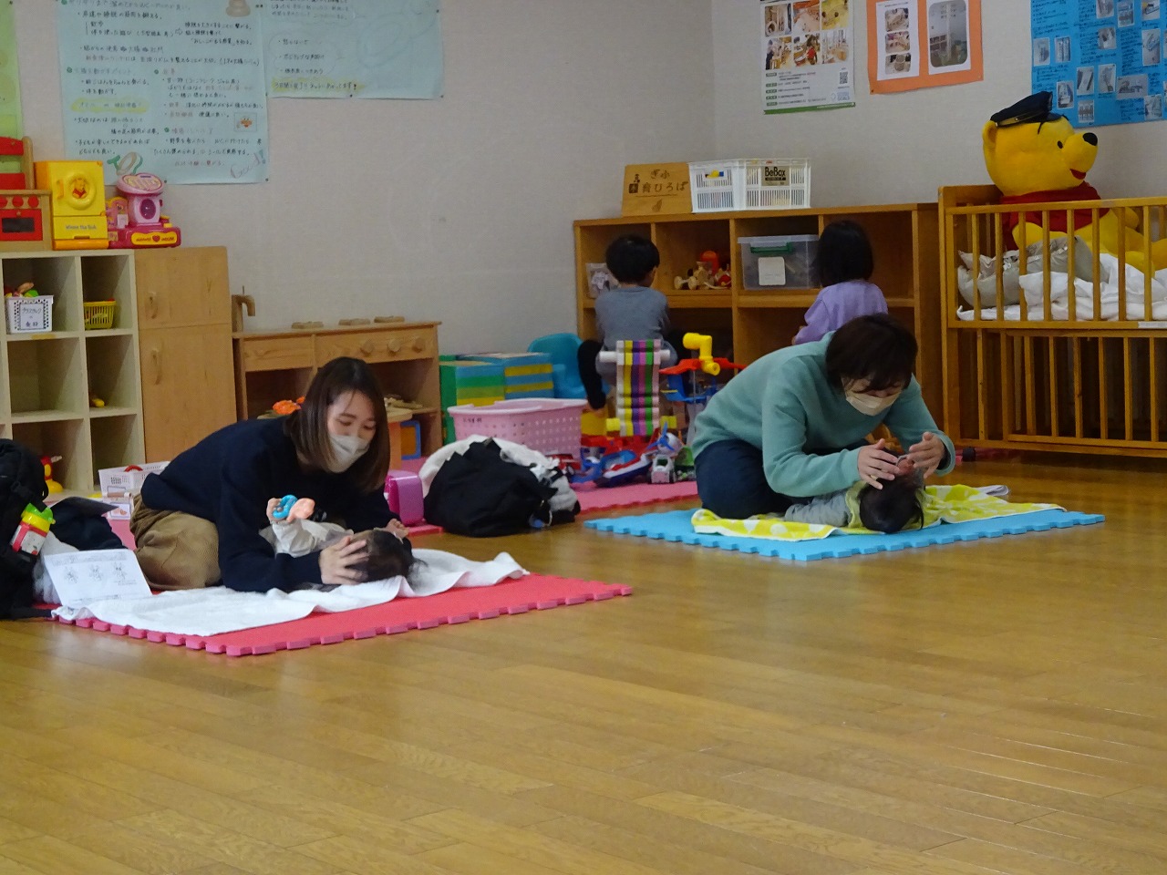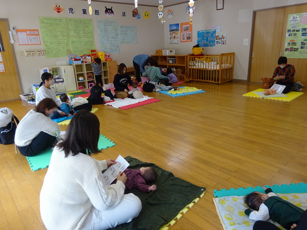 2月26日(月)北児童館でミニ講座「ベビーマッサージ」がおこなわれ、8組の親子が参加しました。 2ヶ月から7カ月の子まで幅広い参加でしたが、初めての方も顔なじみのかたもわきあいあいとベビーマッサージをすることができ、同級生の出会いを喜んでみえたようでした。座談会では、赤ちゃんの便秘の話や花粉症の話など普段聞けないようなことも相談でき、有意義な時間となりました。