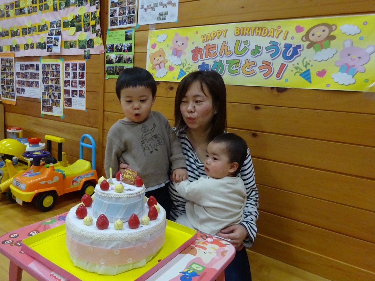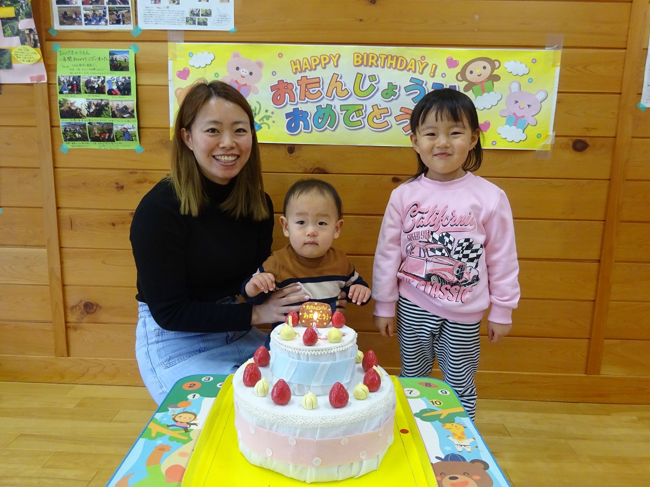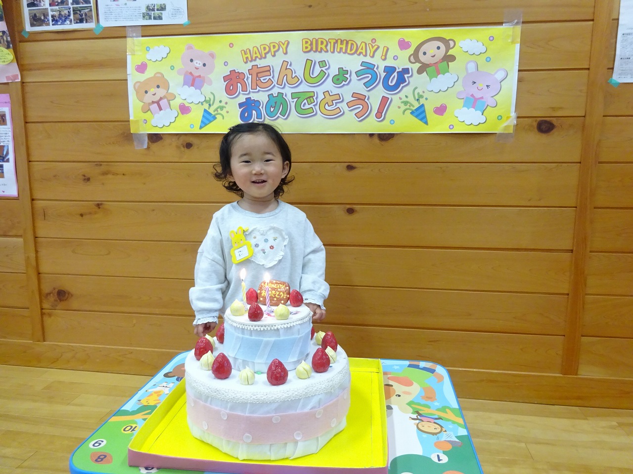 2月は、12月、1月にできなかった親子も含めて7組の親子が参加しました。 友だちの誕生会の時にお祝いしてくれていたお子さんも多かったので、自分の番がきたことがとてもうれしかったようで、とてもいい表情で写真を撮らせてくれました。みんなに歌をうたってもらう時の恥ずかしそうな笑顔がとてもかわいかったです。