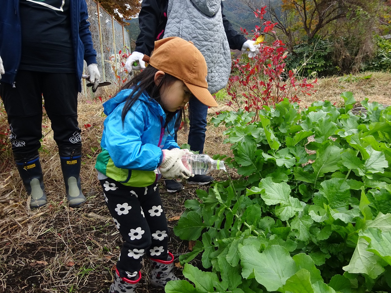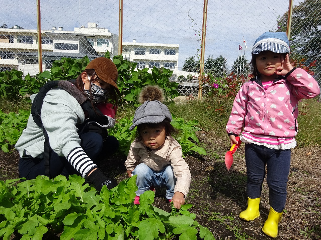 おひさま農園『草取りと水やり』を行いました。今シーズン最多の参加がありました。前回よりも大きく生長した大根に驚いていました。「どれが一番おおきいかなぁー」と大きさ比べをしたり、周囲の草取りをしながら、気がついたら虫取りに夢中になって遊んだでいたり…と、楽しい時間を過ごすことが出来ました。最後に「おおきくなーれ」と願いを込めて、子ども達が水やりをしてくれました。 |