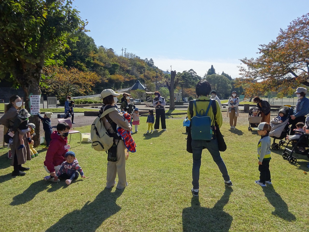 秋晴れの空のもと、乳幼児学級の開級式・どんぐり拾いをしてマラカス作りを行いました。今年度はなかなか活動ができない中ではありましたが、小さなお子さんを持つ親子の皆さんが楽しめるよう、役員さんが主体となって準備を進めて来られました。子供たちの笑顔があふれ、公園中にカシャカシャとどんぐりの素敵な音色が響き渡っていました。最後に朋子先生による絵本の『読み聞かせ』があり、楽しい時間となりました。 |