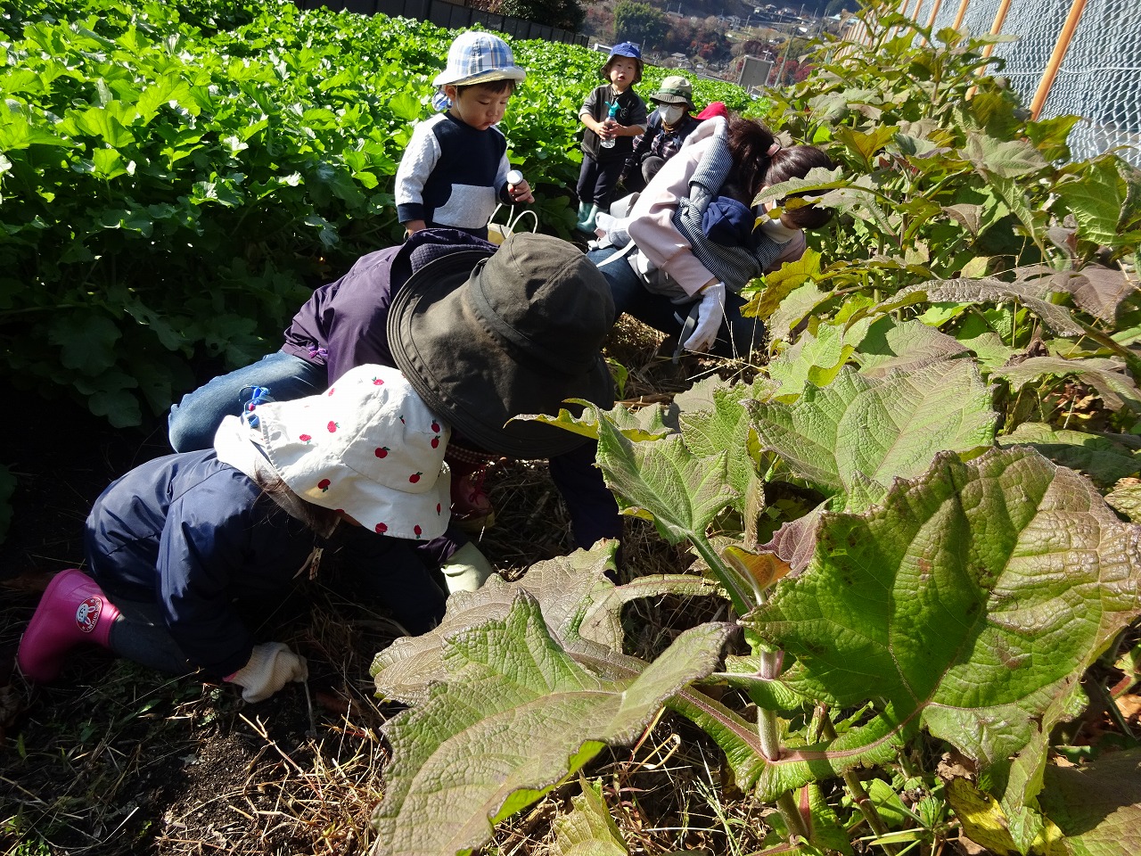 この日は天気も良く、収穫日和となりました。畑に到着すると、土から顔を出した大根がこちらを見ているようで、「わー、大根さんが見えるー」「大きくなってるー」と皆さん大喜び!親子で「うんとこしょ!どっこいしょ!」と掛け声をかけて抜く場面も。ヤーコンも「おいもだー!」と喜んで、夢中で掘りました。今年も大豊作でした。 |