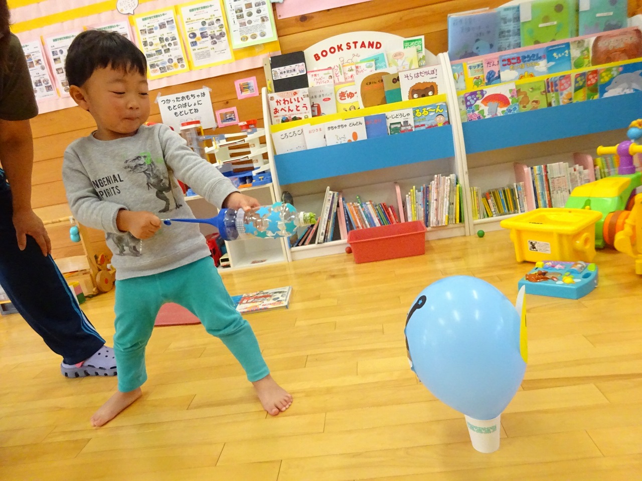 今月は、風船オバケをペットボトル空気砲で倒して遊ぶ玩具と、廃材の缶などを使ってドラムを作り、楽器ととして楽しむ玩具の製作キットを用意しました。センターに遊びに来てくれたお友だちは、見本の玩具で夢中になって遊んでくれました。是非お家で作って、お子さんと遊んでみてくださいね。 |
