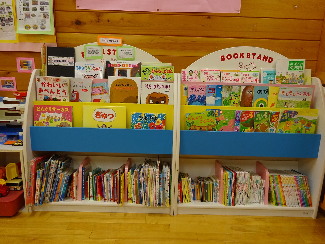 今月から、絵本と育児書の貸し出しを始めました。お家で過ごす時間、入眠前の決まった時間等々、親子で絵本に親しんでもらったり、絵本の世界観を楽しんでもらえたらと思っています。お気に入りの一冊が見つかるといいなと思っています。是非、借りにいらしてくださいね。 |