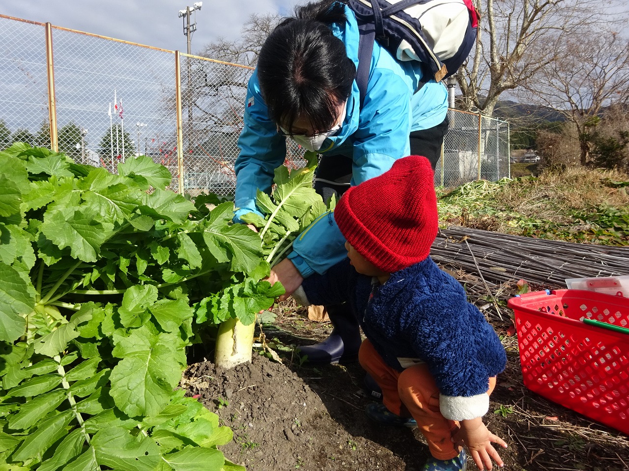 先日種まきをした大根が芽を出し、すくすくと生長しています。そこで間引きをして、さらに大きくなるようお世話をしました。畑に到着すると早速、畑で土遊びが始まりました。子供たちの生き生きとした姿がとても微笑ましかったです。親子で一緒に間引きをした大根の葉を持ち帰ってもらいました。料理談議に花も咲き、楽しい雰囲気の中活動を行いました。興味のある方、一緒に土に触れて農園活動を楽しんでみませんか? |