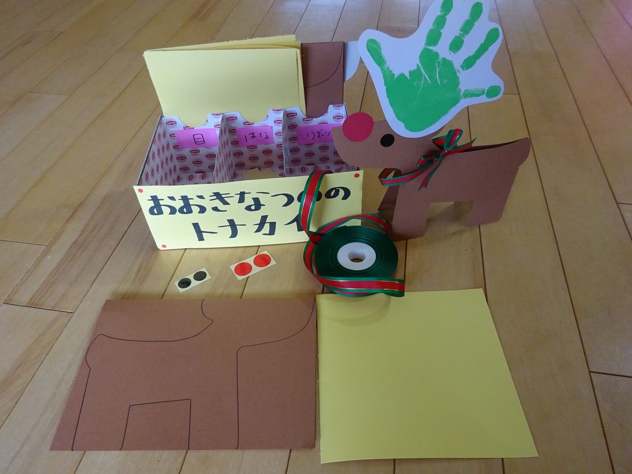 今月は、画用紙を折ってツリーを作り、そこに飾りを付けたクリスマスツリーと、お子さんの手形を角に見立てて飾るトナカイの2種類の製作キットを準備しました。季節やイベントにちなんだ製作となっています。是非、お家で作って飾ってみてくださいね。 |