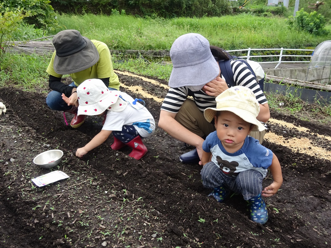 おひさま農園で『大根の種まき』を行いました。今日は3組の参加がありました。畑では、NPO職員に種まきの仕方を教わりながら、小さな赤い種を1粒ずつ指でつまんで、丁寧にまくことが出来ました。今後も、収穫の時を楽しみにしながら、草取りや水やりの世話をしていきたいと思います。。 |