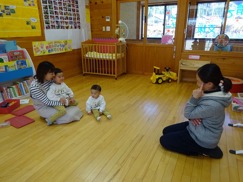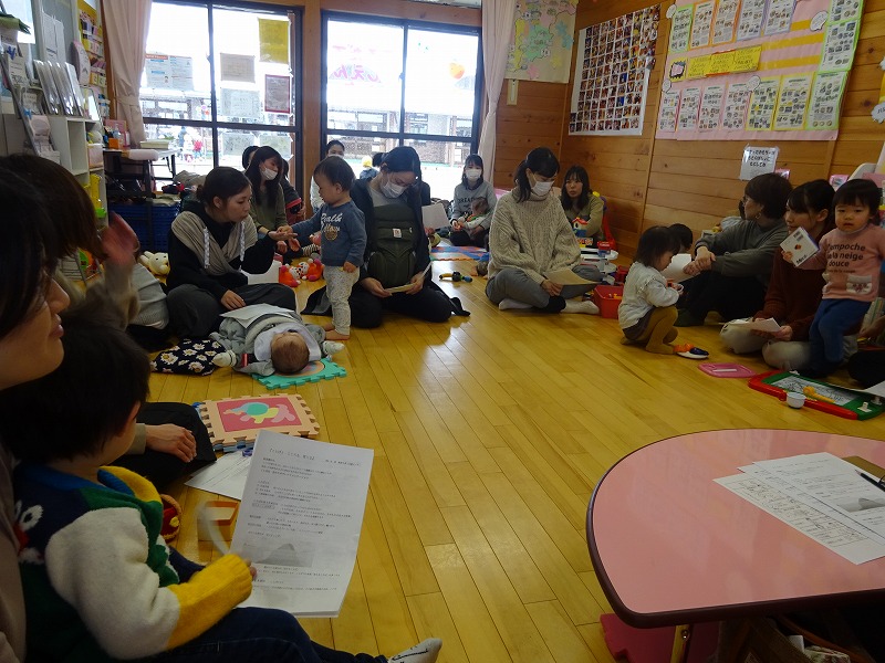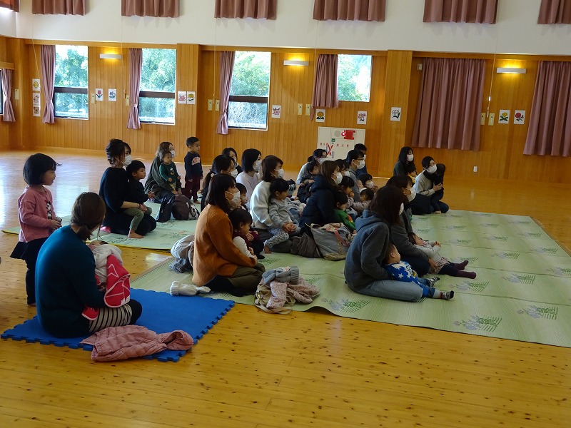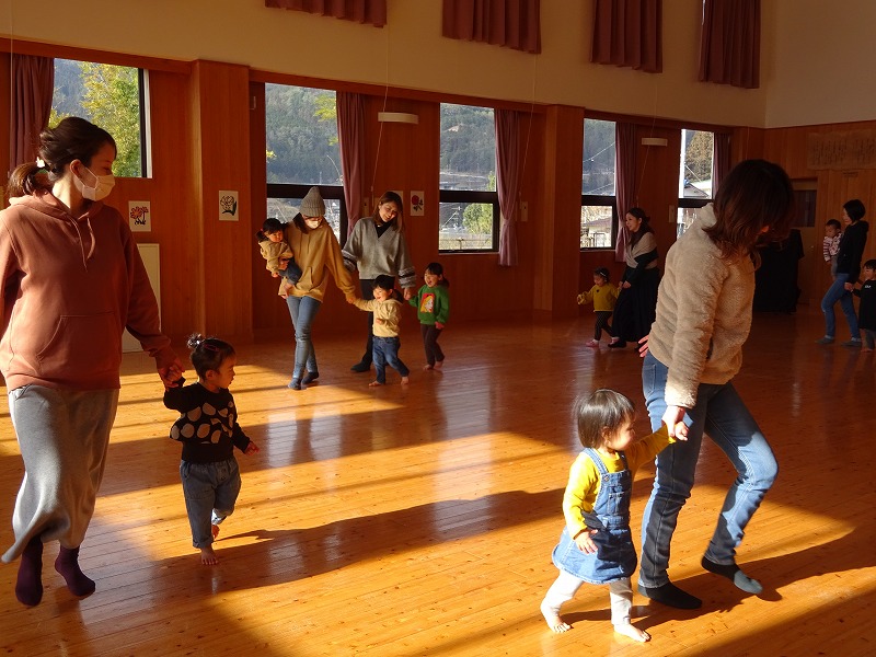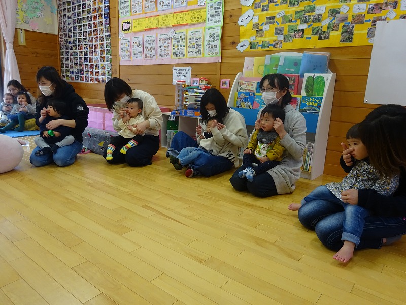 今日のぽっかぽっかDayは「リトミック」を行いました。20組46人の参加がありました。みちる保育士が奏でるピアノの音に合わせ、歌ったり、動いたり、しゃがんだり、高い高いをしたり、可愛い動物になりきり模倣遊びをしたり…。親子で楽しそうに体を動かす姿や子どもたちの嬉しそうな溢れんばかりの最高の笑顔がみられる時間となりました。 |